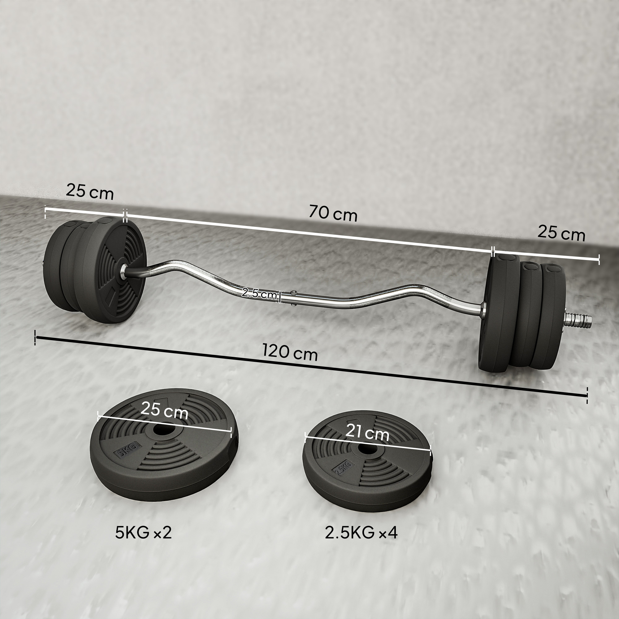 Arm curls, deadlifts, squats and much more, this SPORTNOW weights barbell set transforms your home gym and elevates your workouts. 25kg in total, this set comes with two 5kg and four 2.5kg weight plates and a 5kg bar. Designed for ease and comfort, its non-slip grip ensures sessions are safe and efficient, while the protective plastic coating keeps your gear in great condition. If you're looking to improve strength and fitness, this set is the one for you.