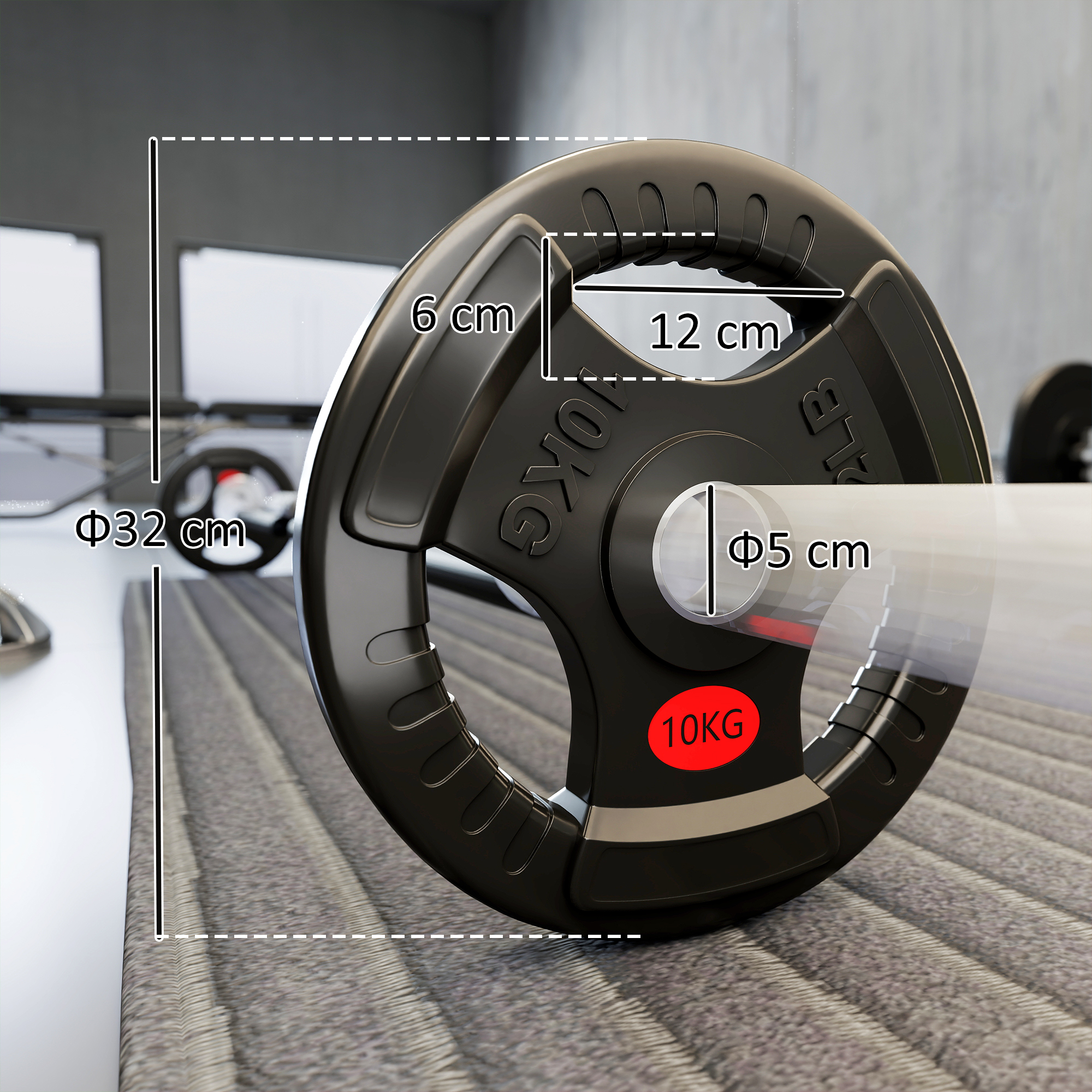 These SPORTNOW 2 x 10 kg Olympic weight plates are made from solid steel and feature a PVC coating for corrosion resistance, noise reduction and floor protection. Designed with three cut-out grip holes for easy handling, they fit all Olympic barbells with a 2" collar opening. Clear KG markings ensure easy identification and the versatile plates can also be used for a variety of exercises beyond barbell training.