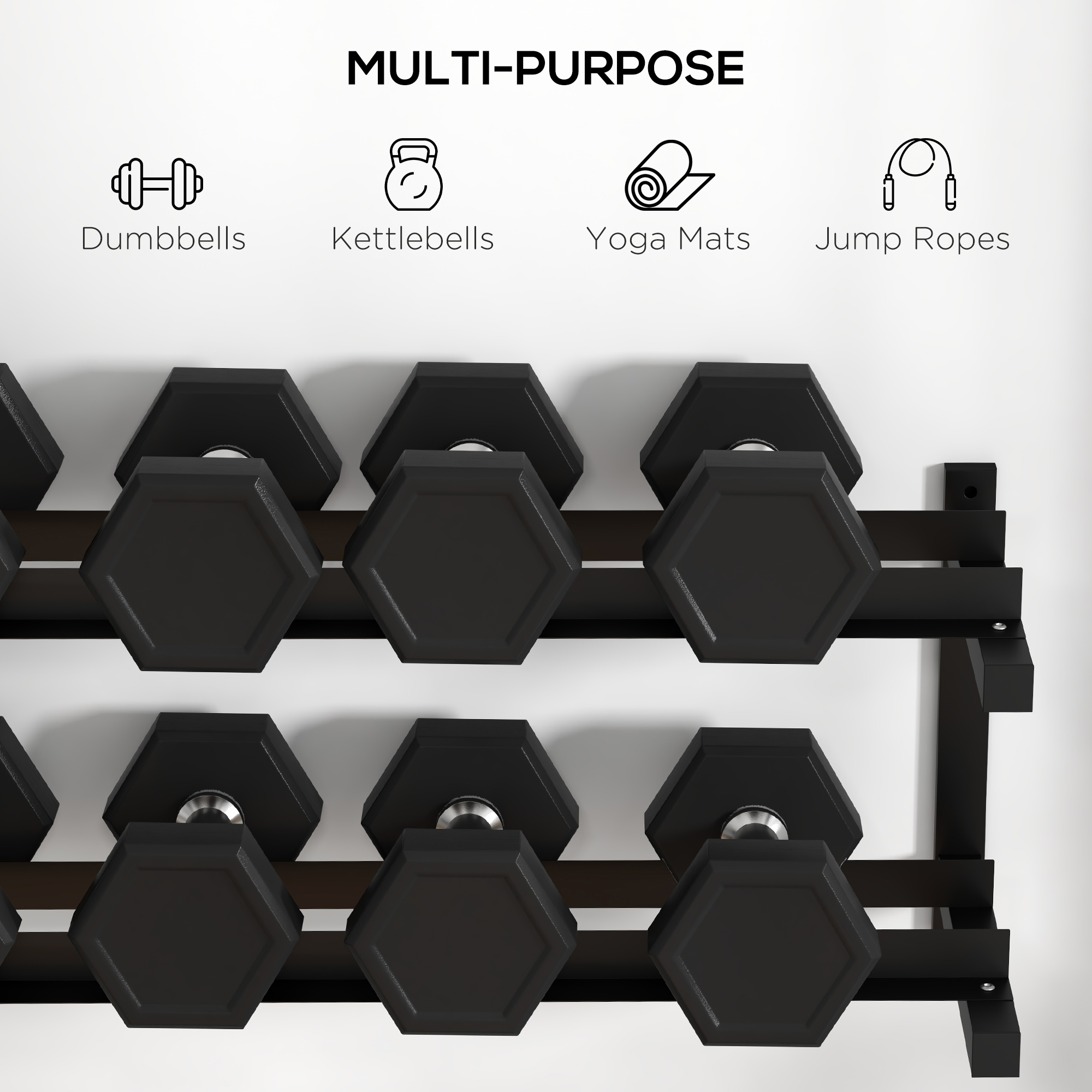 Maximise your home gym space with this wall-mounted weight rack. Its double-layer, 98 cm design holds multiple dumbbell sets, kettlebells and weight plates, keeping everything organised and within easy reach. Made from strong steel, it supports weights from 2–25 kg and stays stable during daily use. Perfect for creating a clean, clutter-free workout area, giving you more room to stretch, move and train comfortably.
