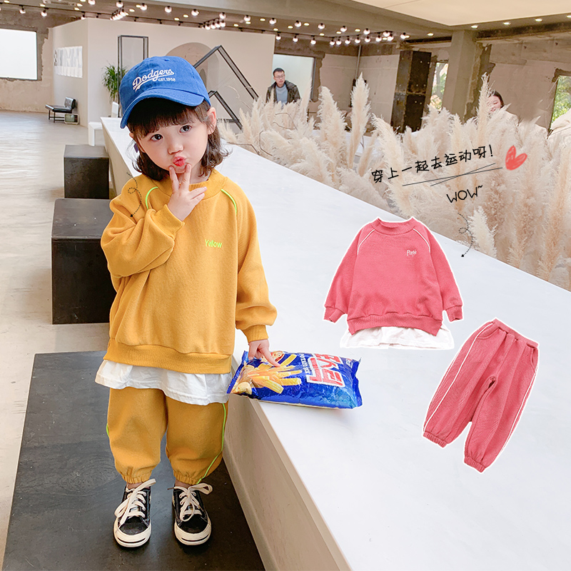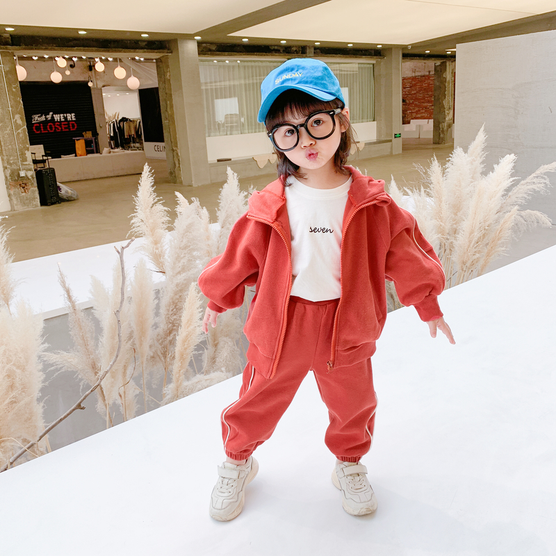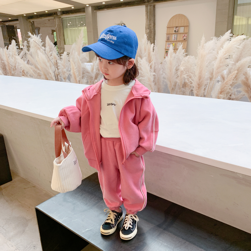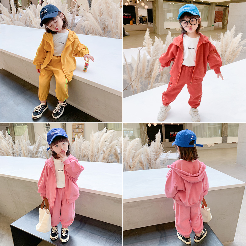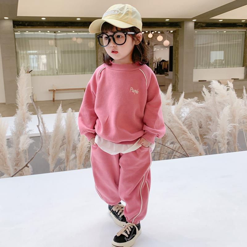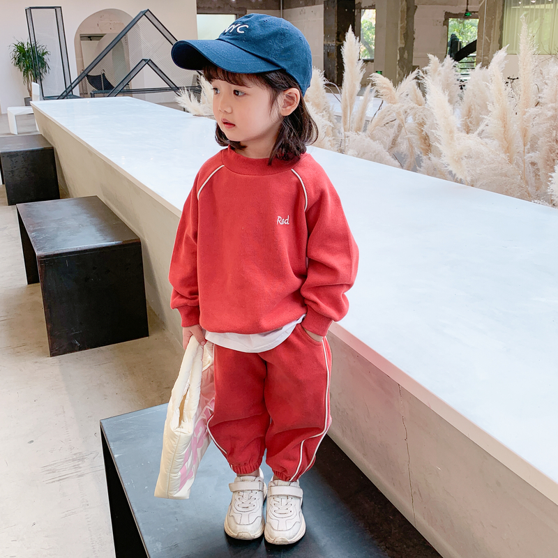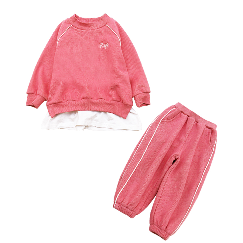 Color classification: red [coat+trousers] two-piece suit, red [sweatshirt+trousers] two-piece suit, pink[coat+trousers] two-piece suit, pink[sweater+trousers] two-piece suit