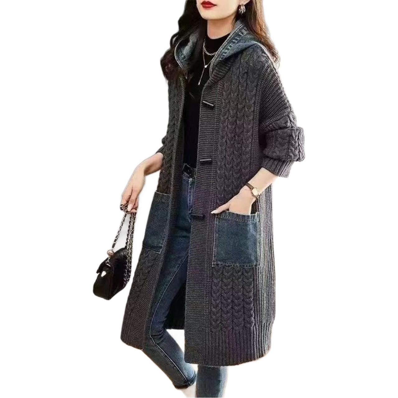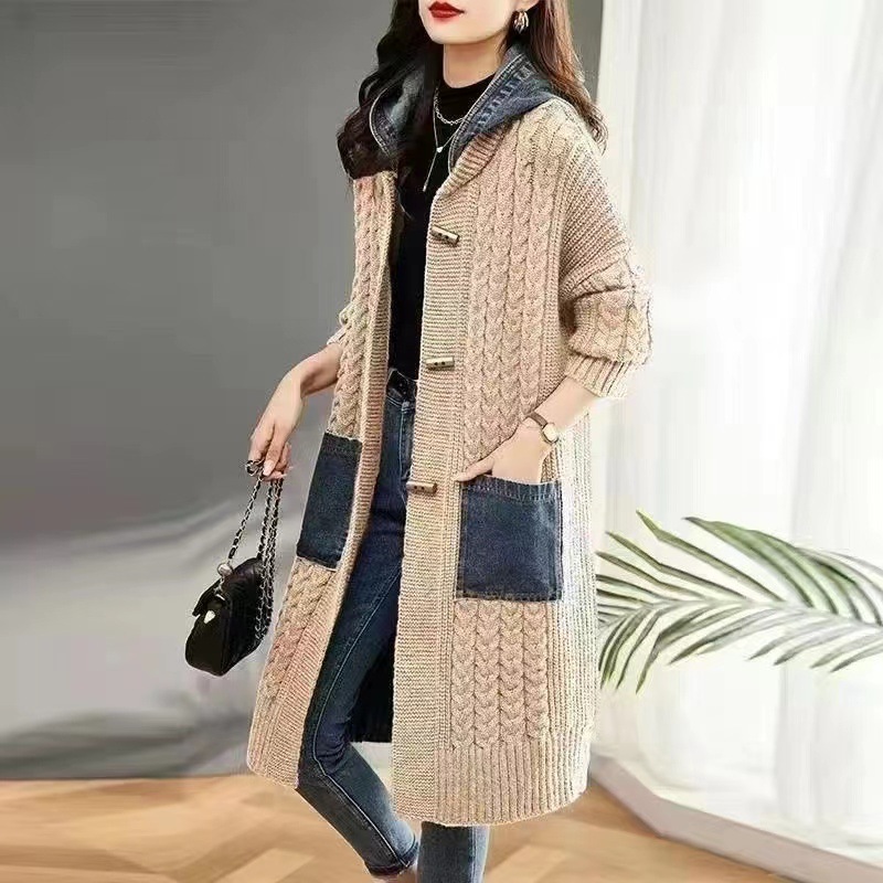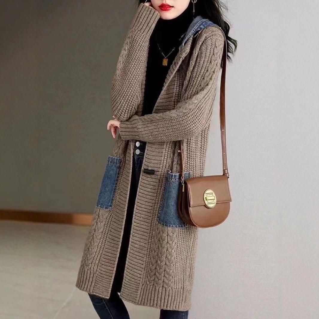 Spring And Autumn Cardigan Mid-length Loose Western Style Outer Wear Hooded Knitted Top