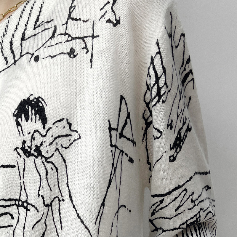Spring And Autumn New Wool Cardigan Graffiti Round Neck Knitted Long Sleeve Baggy Coat