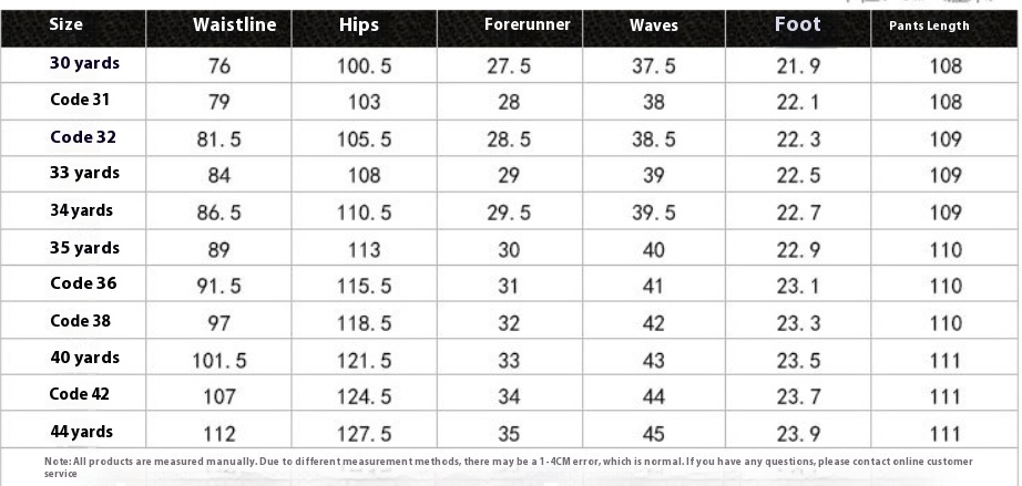 Size: 30 waist 76.5(2.29 feet, 31 waist 79(2.36 feet),32 waist 81.5(2.44 feet, 33 waist 84(2.52 feet),34 waist 86.5(2.59 feet), 35 waist circumference 89(2.67 feet),36 waist circumference 91.5(2.74 feet),38 waist circumference 96.5(2.89 feet),40 waist circumference 101.5(3.04 feet), 42 waist circumference 106.5(3.19 feet), 44 waist circumference 111.5(3.34 feet