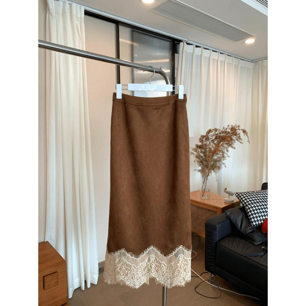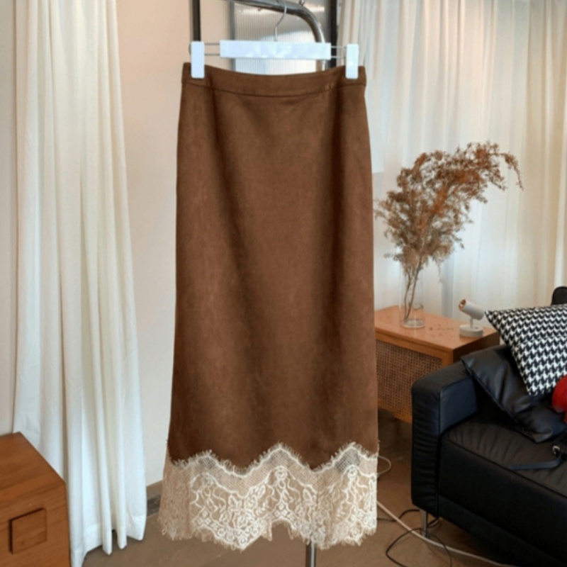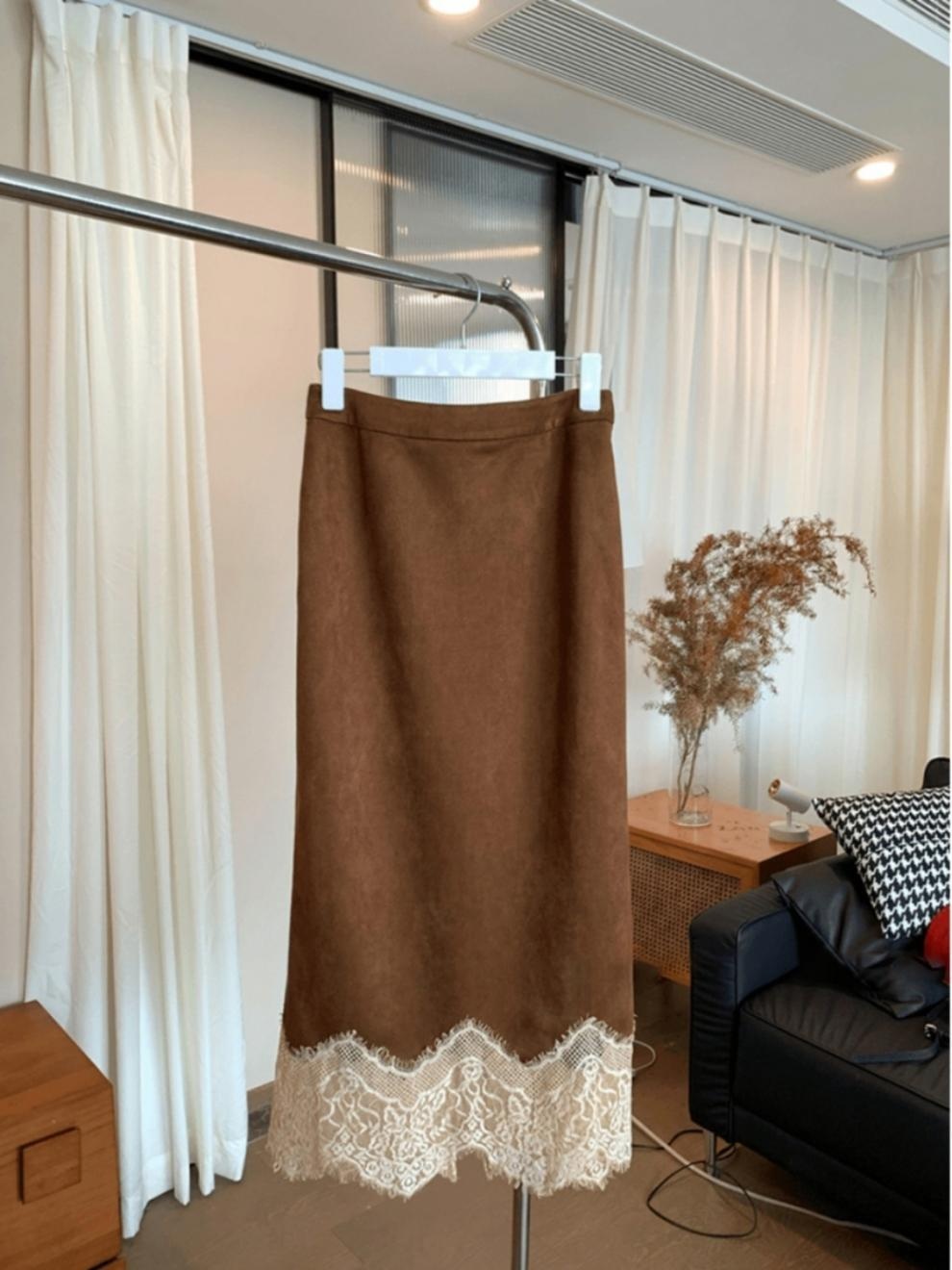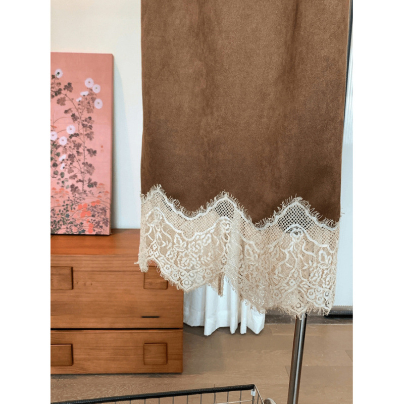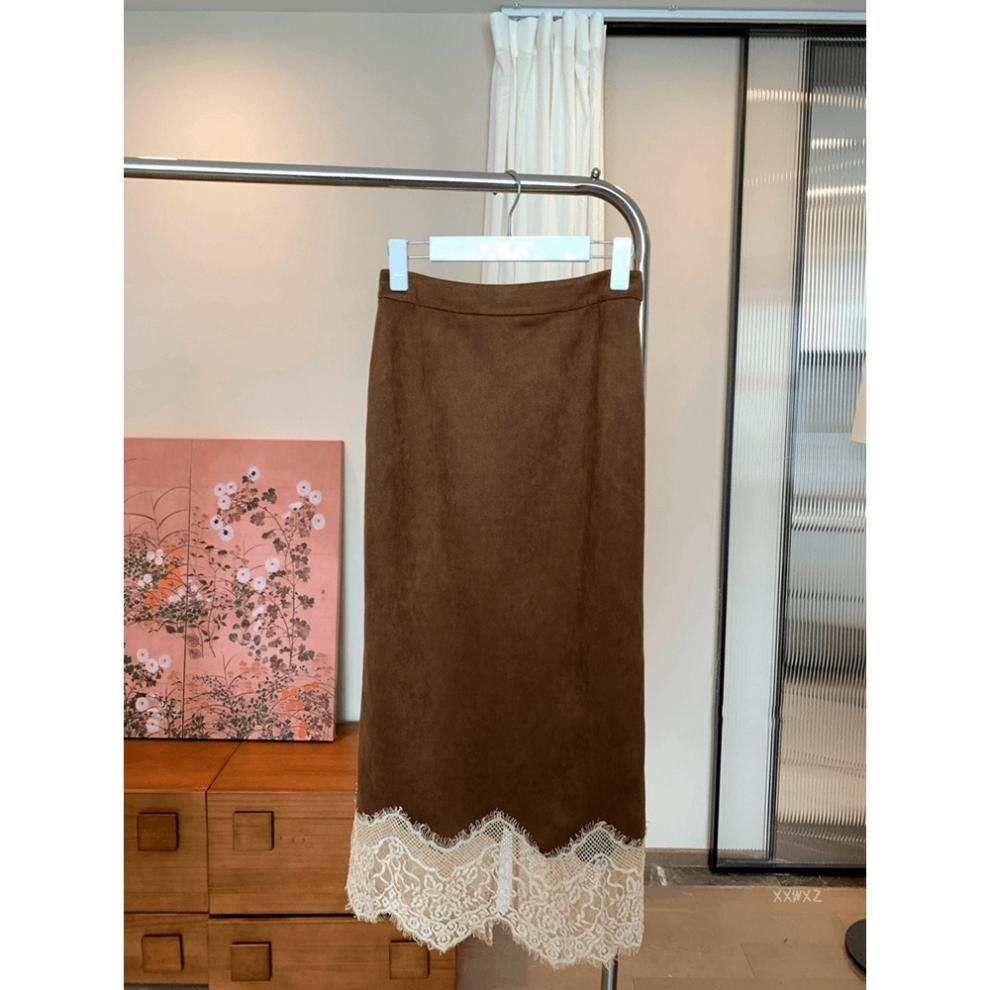Spring And Summer New Elegant Maillard Retro Coffee Color Hem Lace Skirt