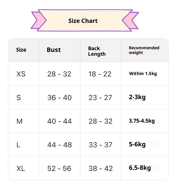 Size: XS chest circumference 30cm, back length 20cm, inner 1.50kg, S chest circumference 38cm, back length 25cm, 2.00 kg-3.00 kg, M chest circumference 42cm, back length 30cm, 3.50 kg-4.50 kg, L chest circumference 46cm, back length 35cm, 5.00 kg-6.00 kg, XL chest circumference 54cm, back length 40cm, 7.00 kg-9.00 kg