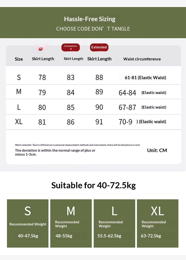 Sizes: S [40–47.5 kg], M [48–55 kg], L [55.5–62.5 kg], XL [63–70 kg]