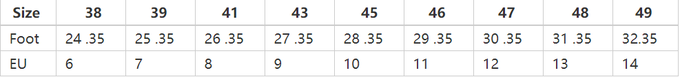 Size: 38, 39, 40, 41, 42, 43, 44, 45, 46, 47, 48, 49