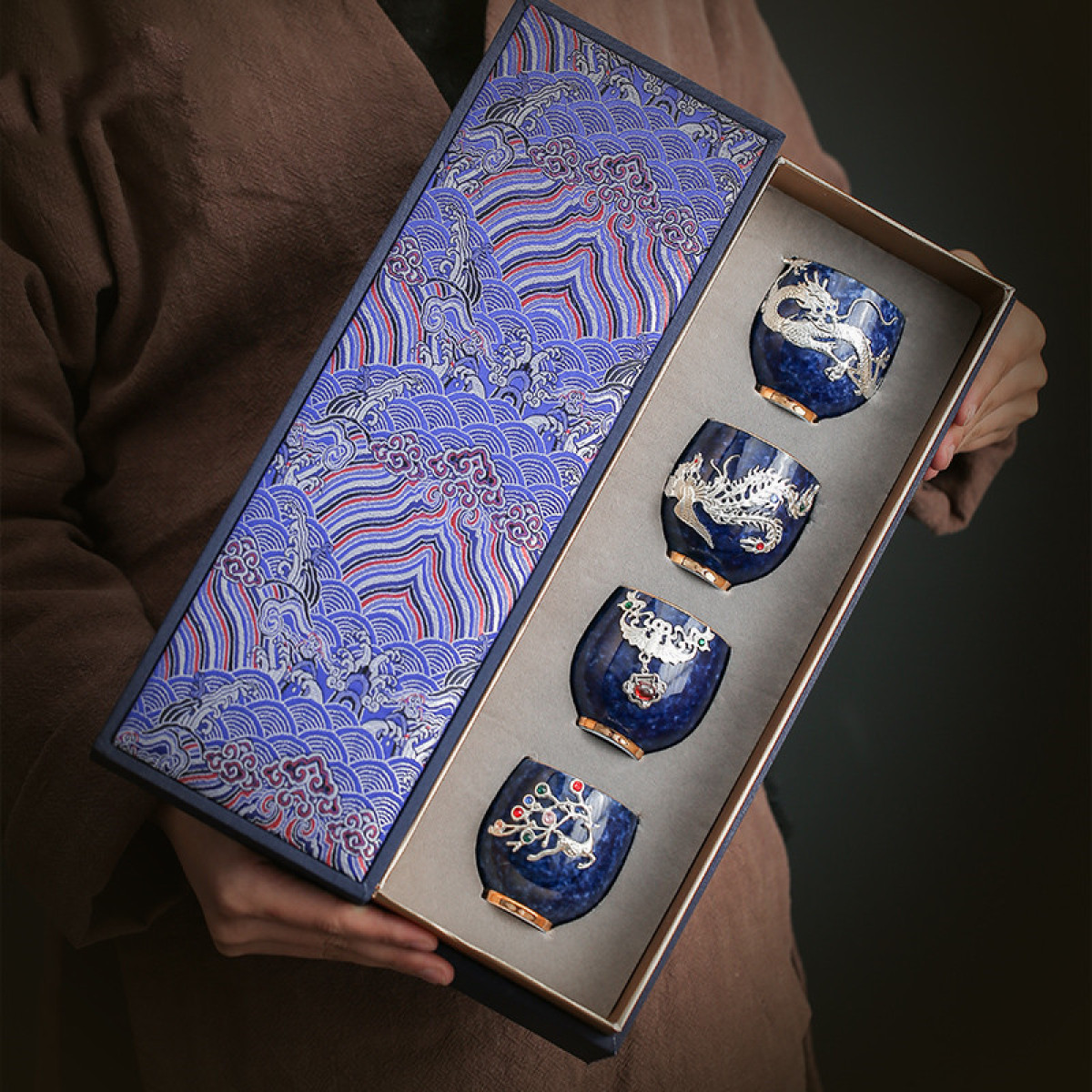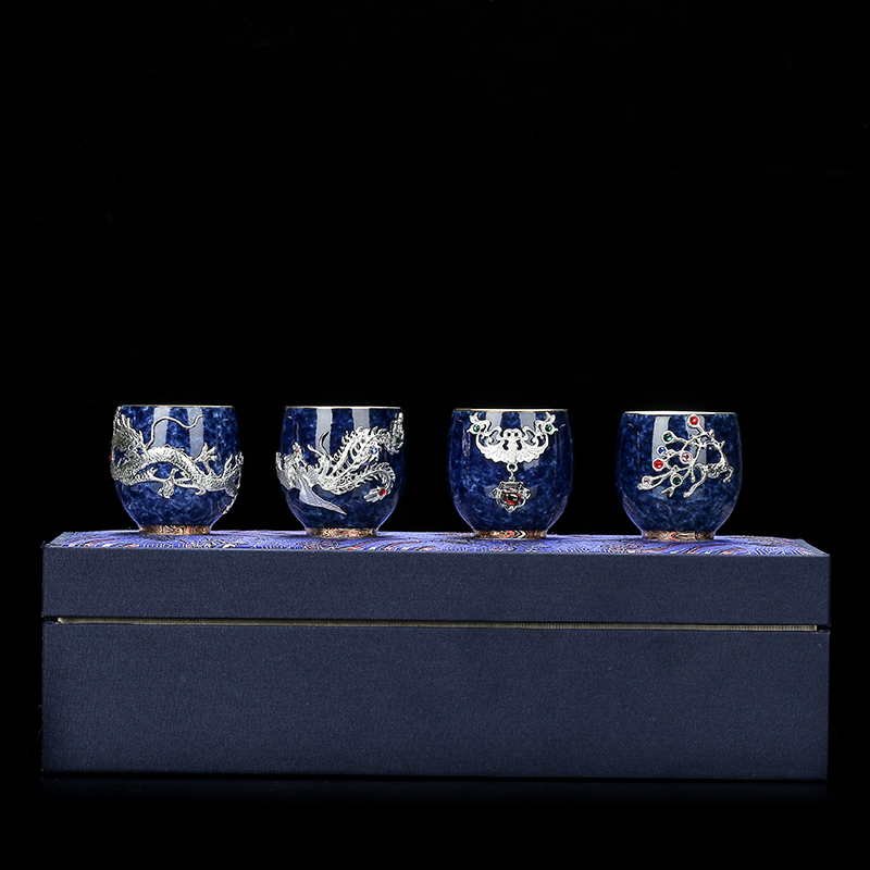P: A complete set of four sprinkled blue cups [Silver Dragon/Phoenix/Fu/Lu]