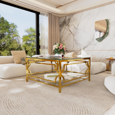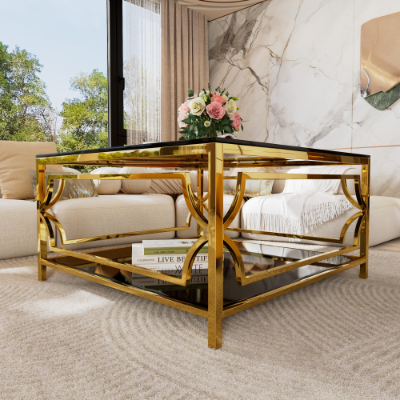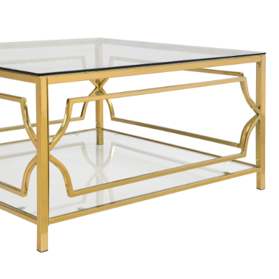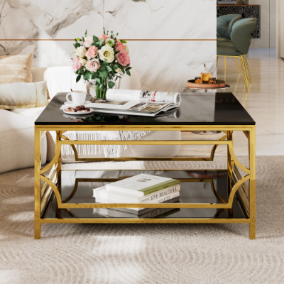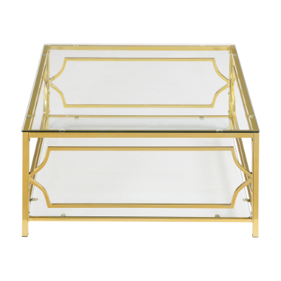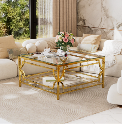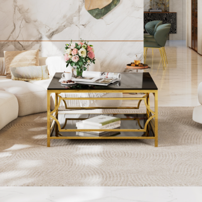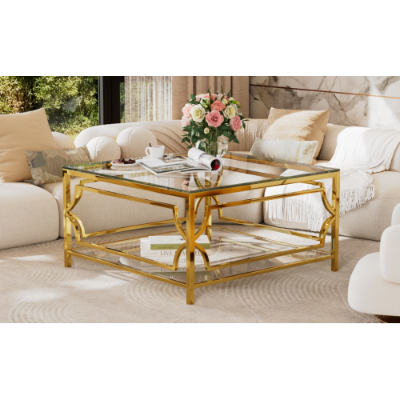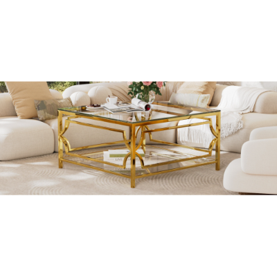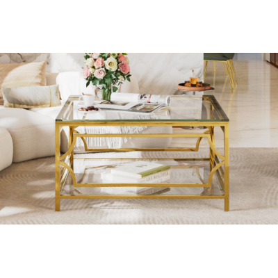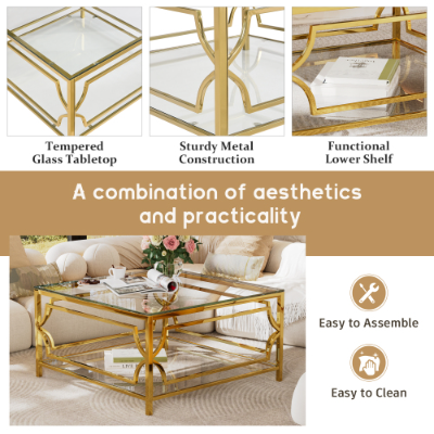Product Name:Square Glass Coffee Table in 33.5",Luxurious Geometric Metal Frame,Gold Finish & Lower Shelf
