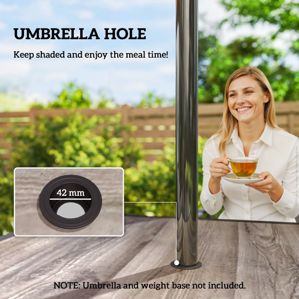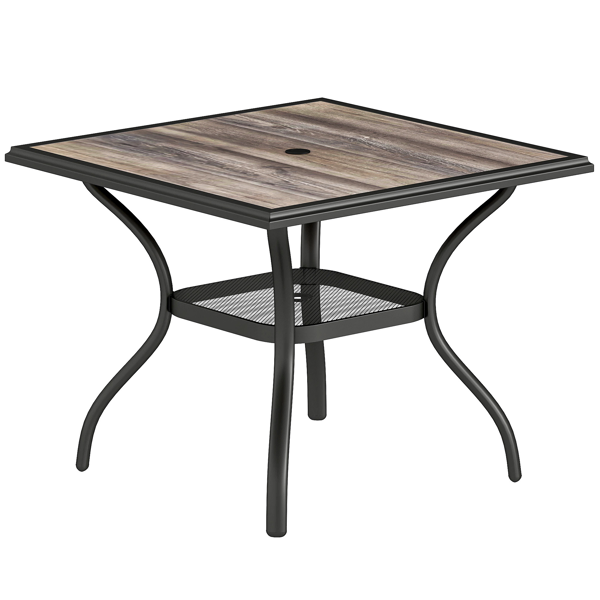 Features: - 37" x 37" outdoor dining table comfortably seating four for intimate gatherings - Built-in bottom wire shelf increases storage options - Faux wood surface offers timeless style with low maintenance - PSPC plastic tabletop is weather-resistant and easy to clean - 1.7" center hole fits most standard patio umbrellas - Powder-coated steel outside table supports up to 110 lbs. - Easy assembly required Specification: - Color: Gray, Black - Material: Steel, PSPC Plastic - Overall Dimension: 37" W x 37" D x 28.3" H - Umbrella Hole Size: 1.7" Dia. - Compatible Pole Size: 1.6"/1.5" Dia. - Fit Weight Base Size: 15.7" L x 15.7" W x 15.7" H (not included) - Maximum Load: 110 lbs.