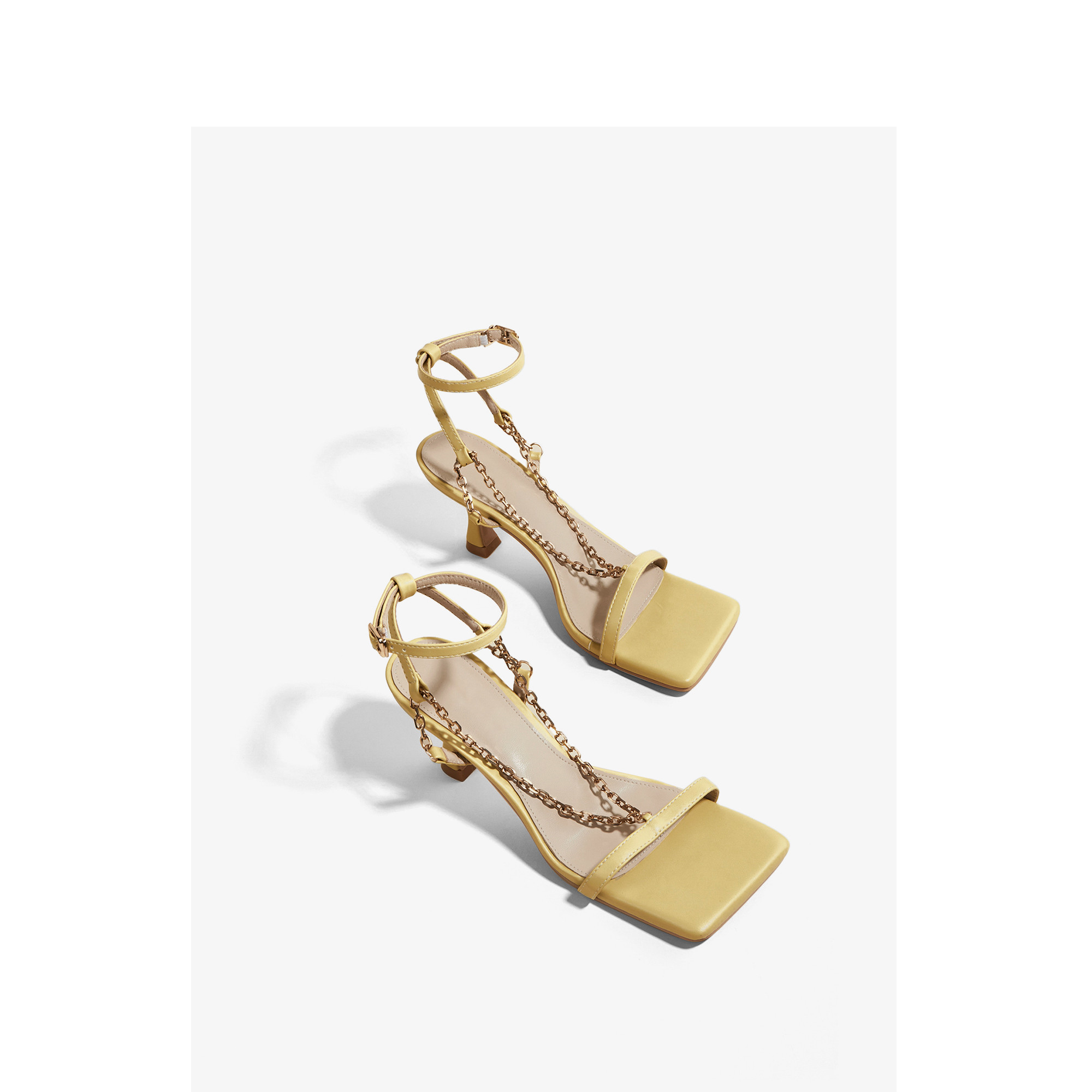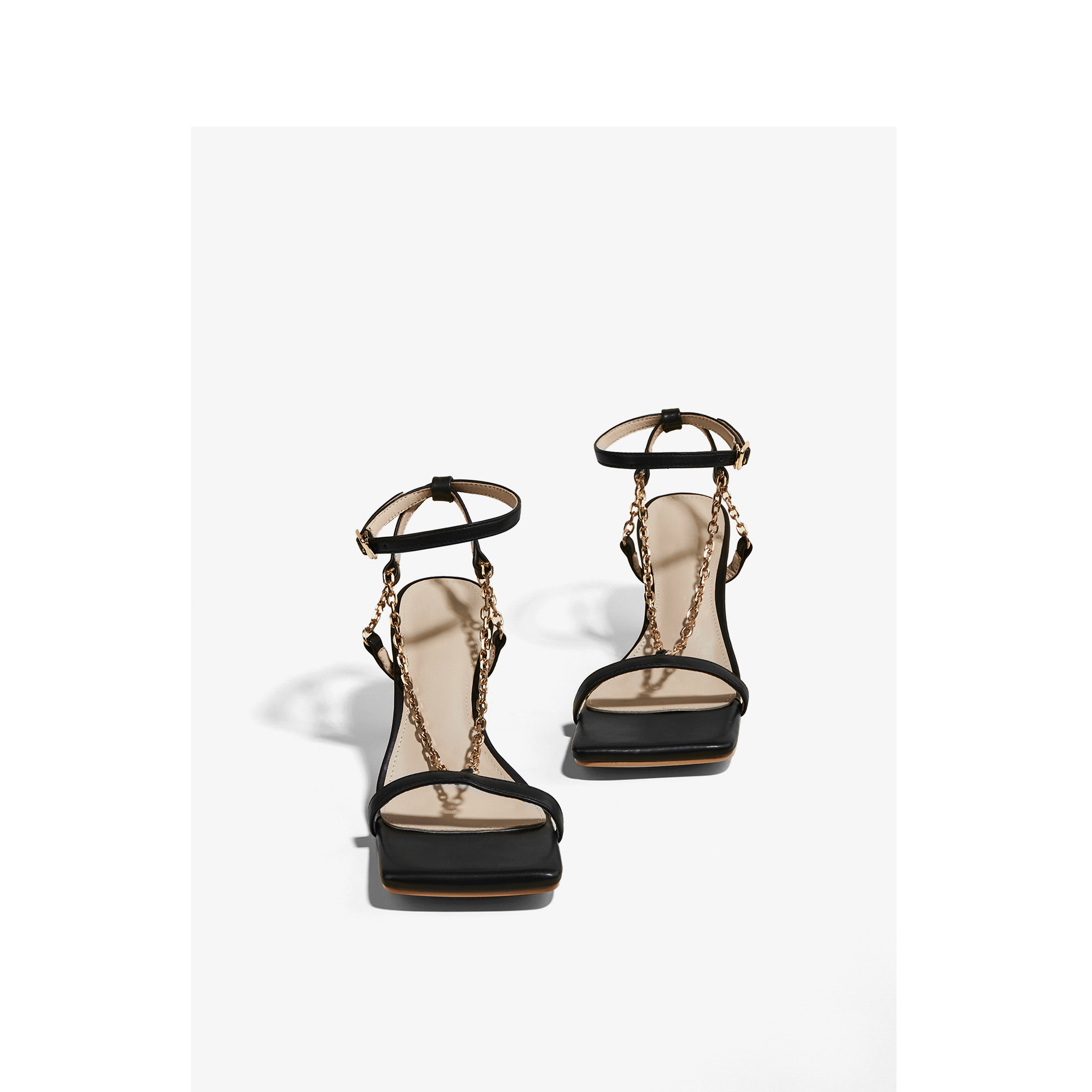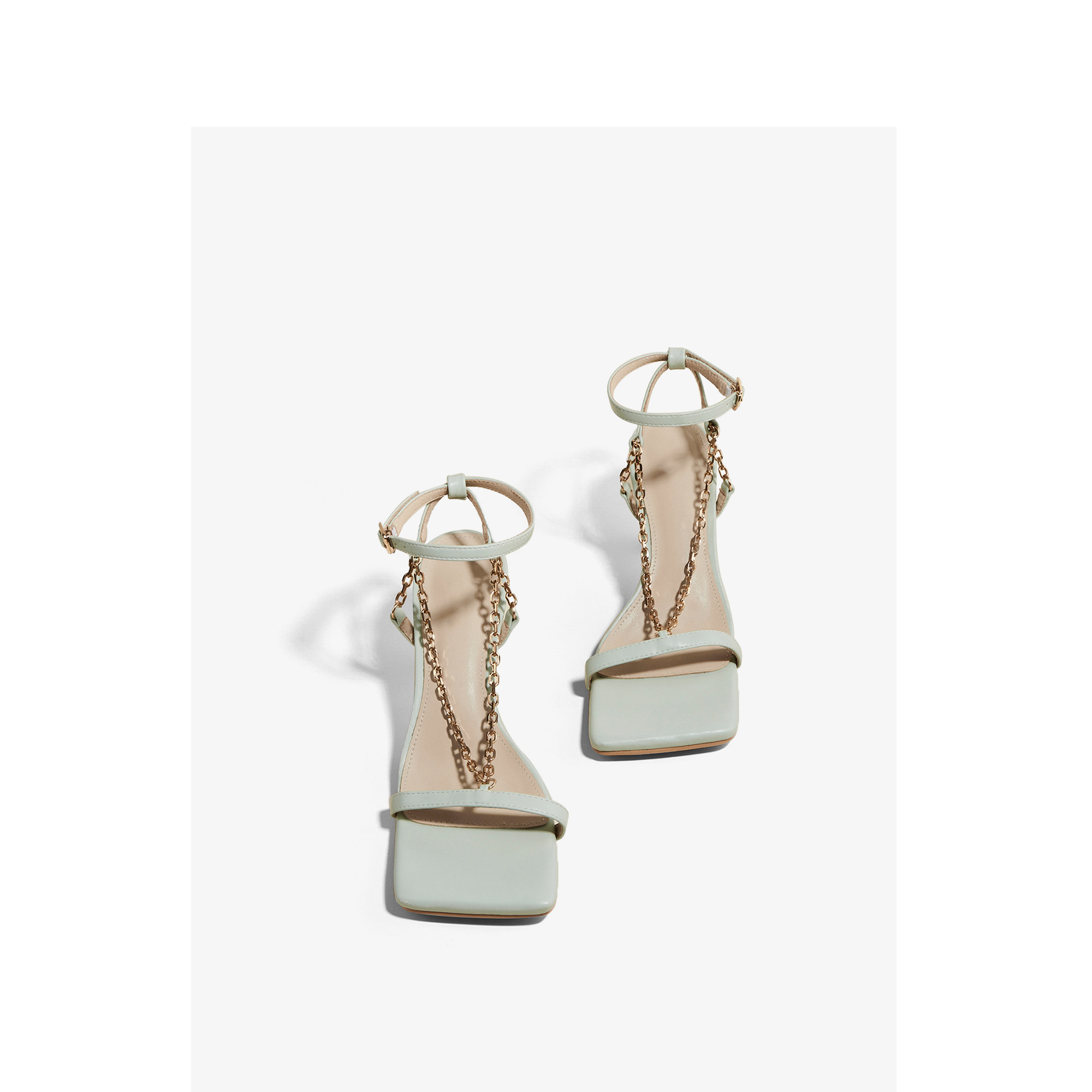 Square Toe Sandals Women Summer Chain Toe Mid-stiletto High Heels Genuine Leather