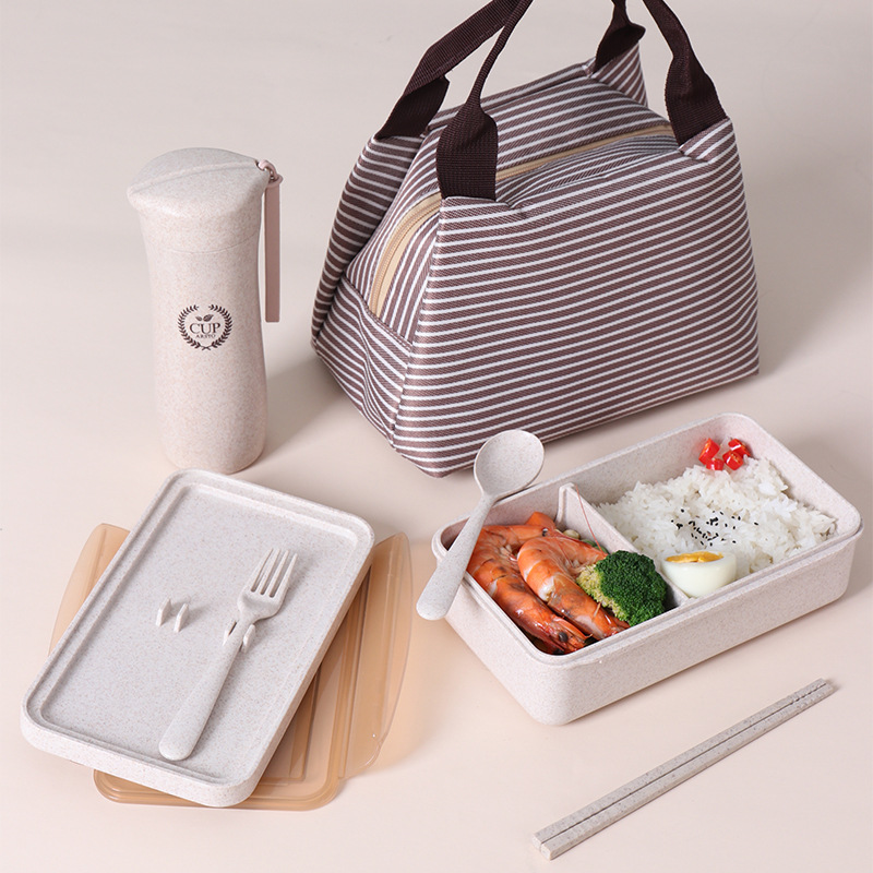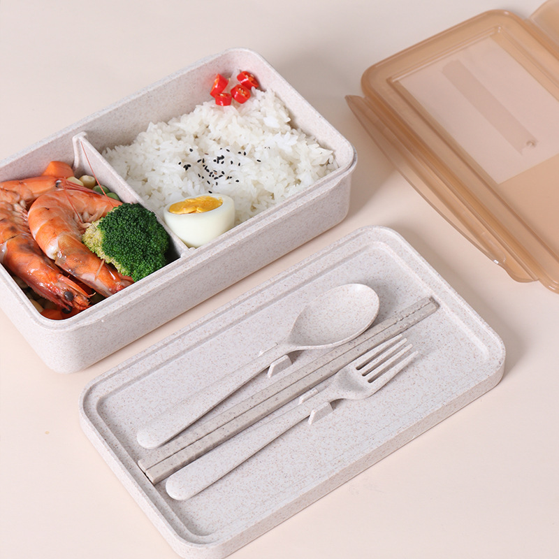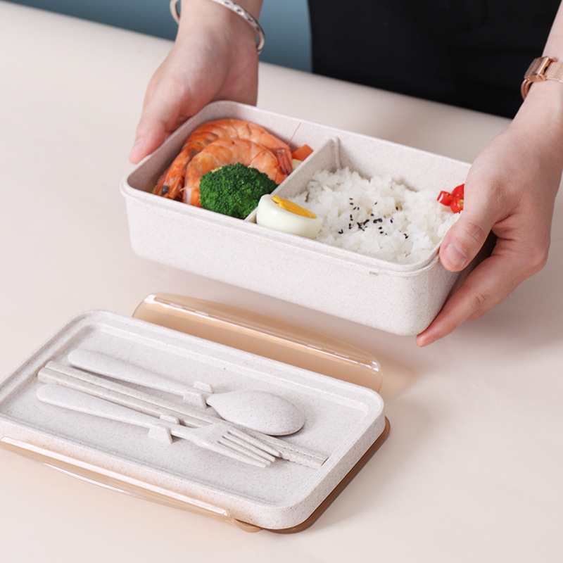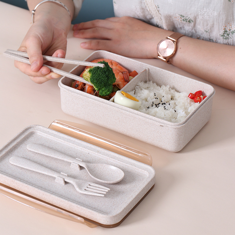 Wheat ready-to-use glass lunch box with fork, spoon and chopsticks gift set square box box lunch box for middle school students