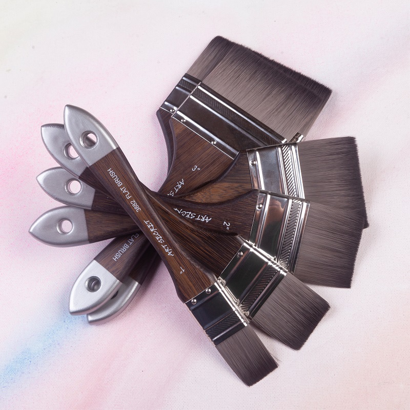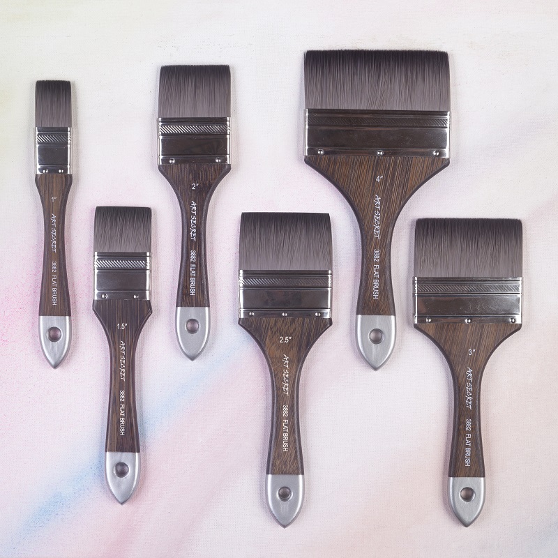 Taklon hair, squirrel-like color, high absorption capacity, good at watercolor, gouache, washbasin, stainless steel card holder, can avoid rust, bamboo handle, ecological