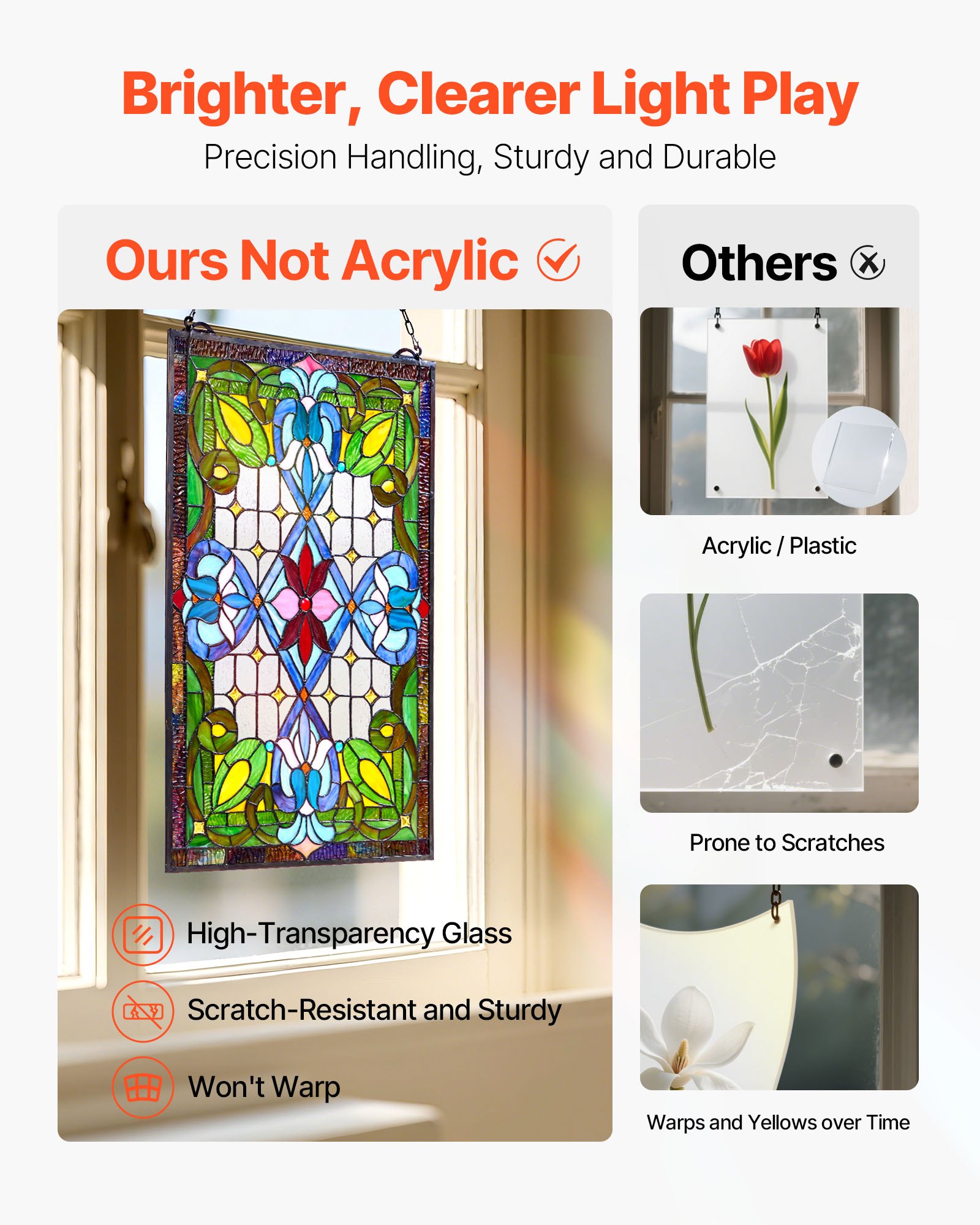 Premium Glass Material: Made from high-quality glass instead of plastic, this stained glass panel for windows provides excellent light transmission, creating dreamy color reflections. It retains its shape and clarity over time