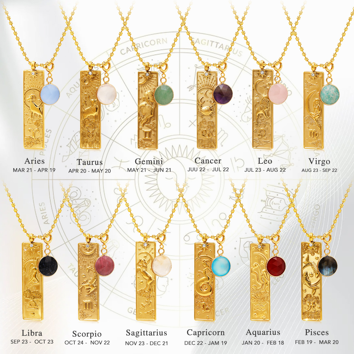 Colors: Aquarius (Jan 20–Feb 18), Capricorn (Dec 22–Jan 19), Virgo (Aug 23–Sep 22), Gemini (May 21–Jun 21), Leo (Jul 23–Aug 22), Scorpio (Oct 24–Nov 22), Cancer (Jun 22–Jul 22), Taurus (Apr 20–May 20), Aries (Mar 21–Apr 19), Sagittarius (Nov 23–Dec 21), Pisces (Feb 19–Mar 20), Libra (Sep 23–Oct 23)