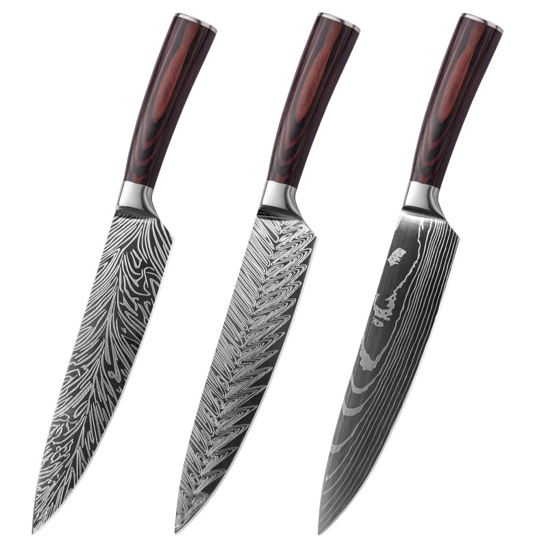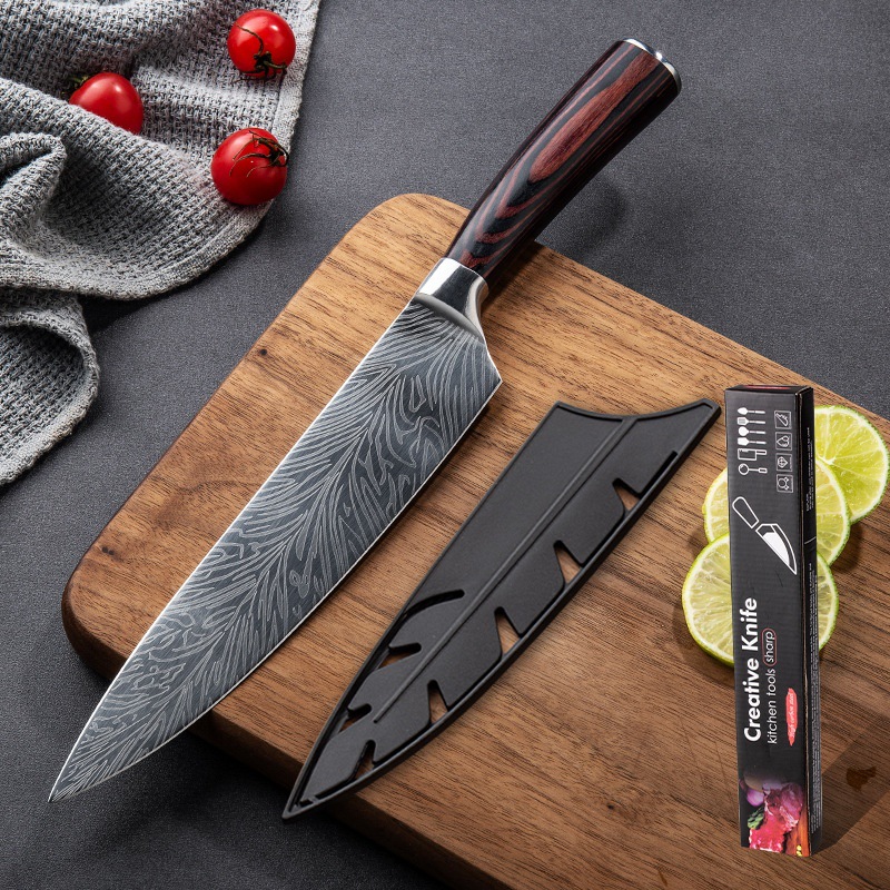 Specification: chefs knife with big horse pattern+knife cover, chefs knife with feather pattern+knife cover, chefs knife with grass pattern+knife cover