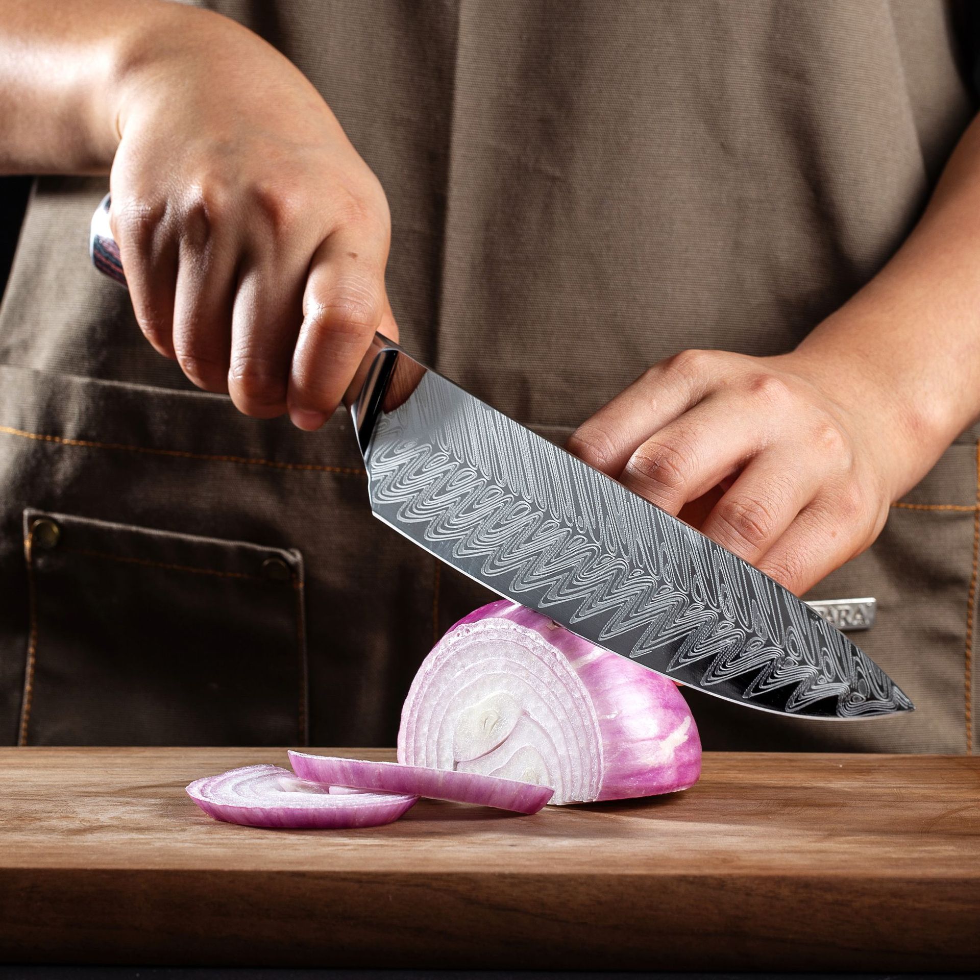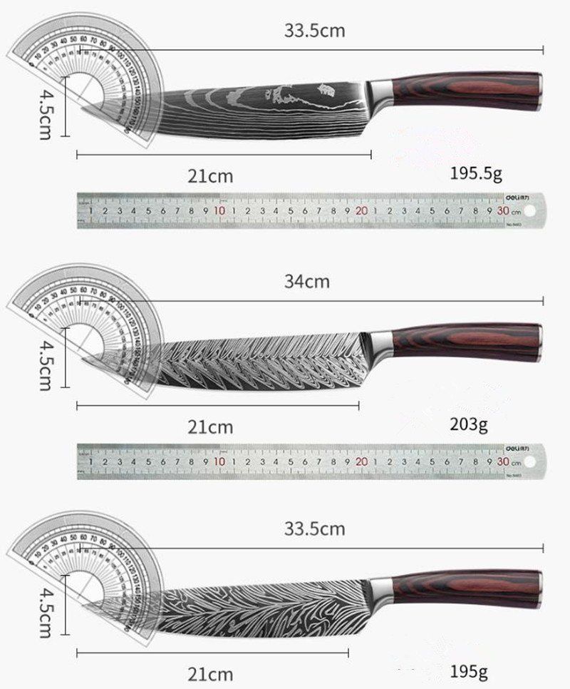 Features: Super sharp edges and perfect curvature (8-12 ° mirror polishing on each side is completed manually) meet all the requirements of the chef for knife setting. Sharp forged edges are easy to cut and can be kept sharp for a long time. The amazing water ripple surface makes your cooking time the most enjoyable time in life.