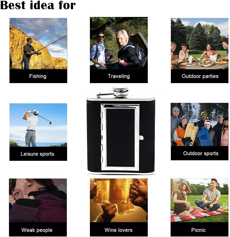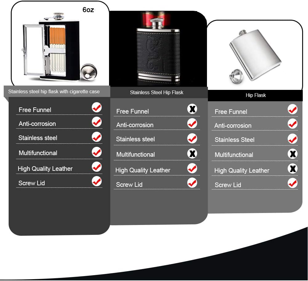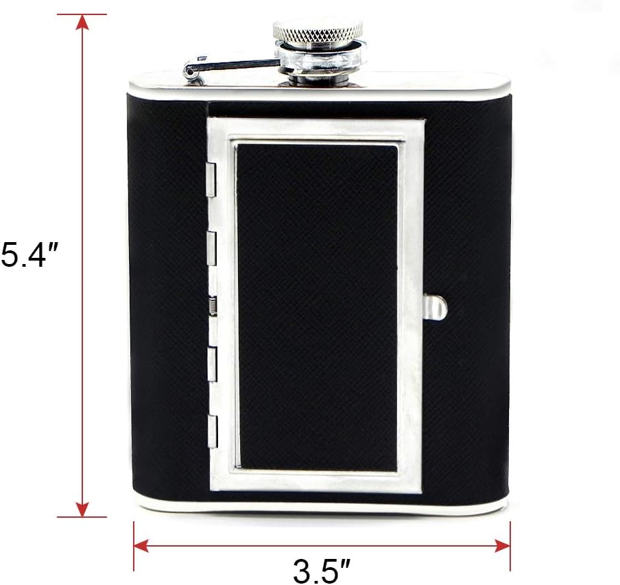 TWO IN ONE DESIGN: The hip flask can hold 6oz of your favorite liquor and has a compartment as built-in case for 6 cigarettes, mints or chewing gums. Its slim contour shape makes it easy to fit or hide discreetly in pocket, fishing box, beach bag or travel bag and an best idea for traveling, concerts and outdoor sports, like fishing, boating, hunting, ski, golf tours, camping, hiking, etc.