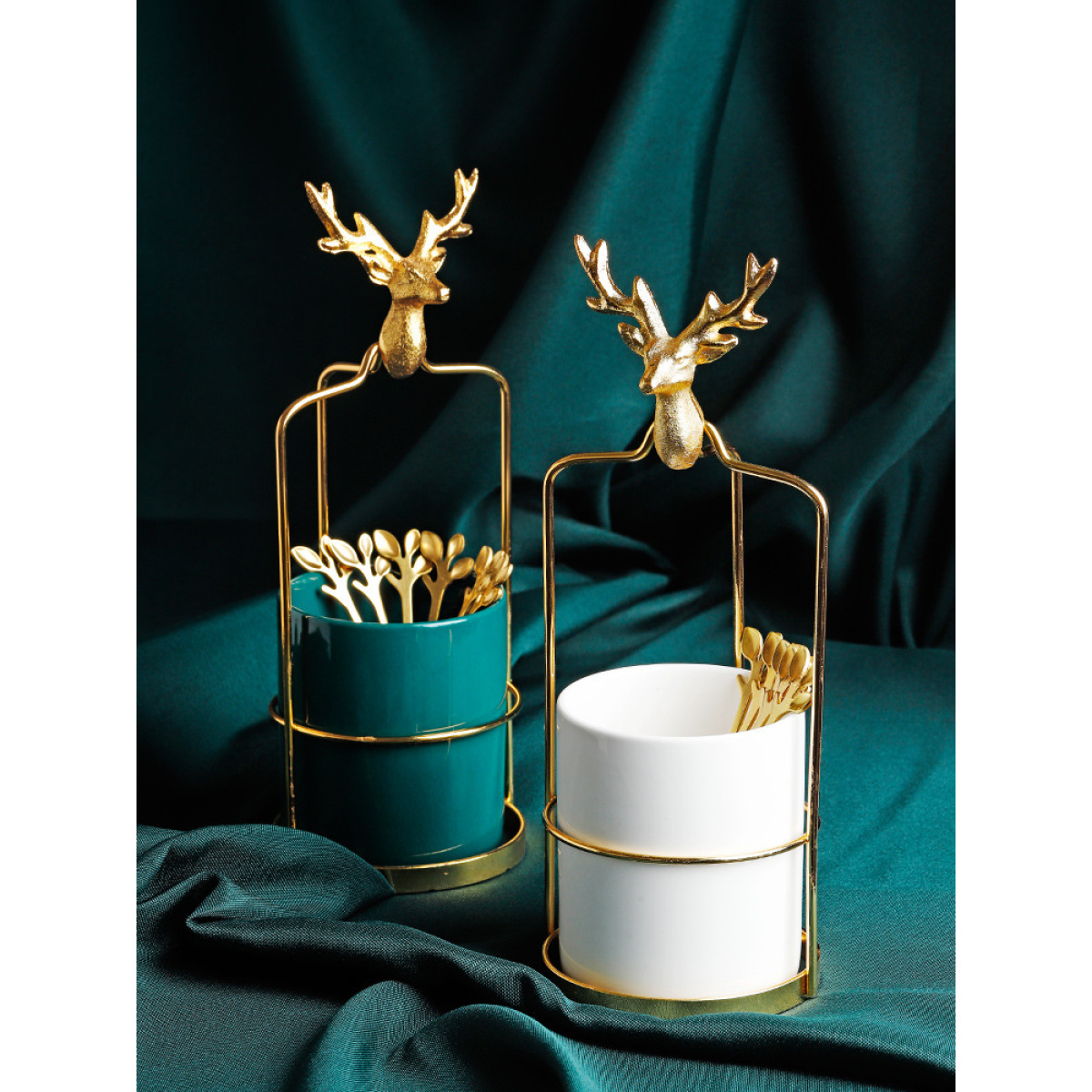 Color: Nordic deer gold frame + emerald light luxury can, Nordic deer gold frame + white light luxury can, Nordic deer gold frame + emerald light luxury can + fruit fork × 6, Nordic deer gold frame + white light luxury can + fruit Forks×6, 6 golden leaf fruit forks, 6 golden leaf spoons, 3 golden leaf fruit forks + 3 golden leaf spoons, green M size