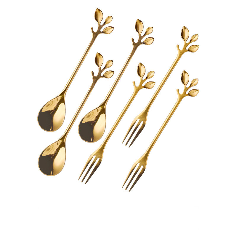 7style: 3 golden leaf fruit forks + 3 golden leaf spoons,