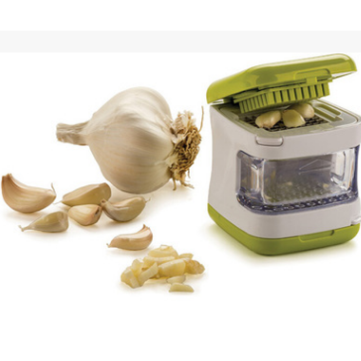 This compact gadget minces or slices peeled garlic and deposits it neatly in the clear bin. Simply open the green lid for the mincing option, align the bin, or flip the cube and bin over for the slicing option.