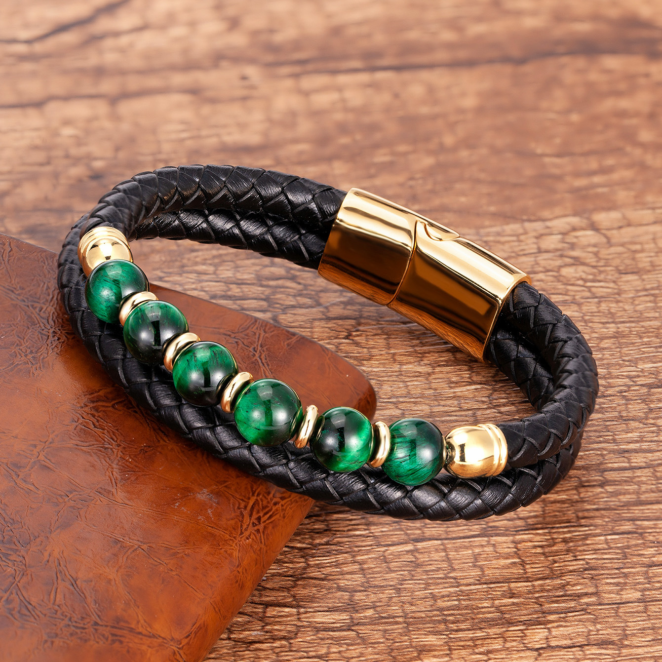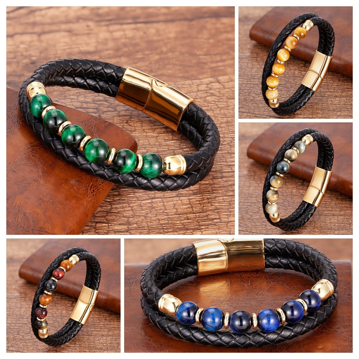 Stainless Steel Jewelry Tigers Eye Bead Double-strand Braided Leather Cord Bracelet