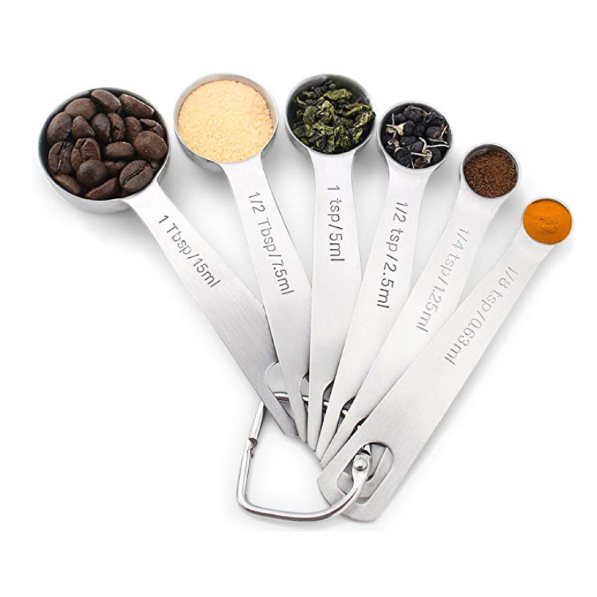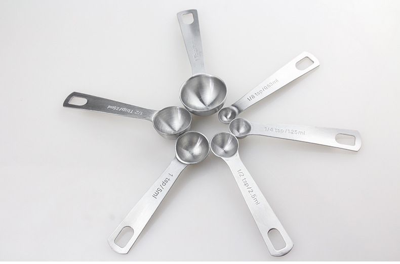 4.THOUGHTFUL DESIGN - Innovative cupped and rounded spoon heads allows reaching into spice jars and other small containers without spilling out. Set Contains 6 spoons: 1/8-tsp, 1/4-tsp, 1/2-tsp, 1-tsp, 1/2-Tbsp. and 1-Tbsp and conveniently connected by a unique D-shape ring which helps to keep the spoons together after a full day of baking or cooking. With each measurement is engraved on the handle of each spoon, there's no guesswork when adding spices to your dishes.