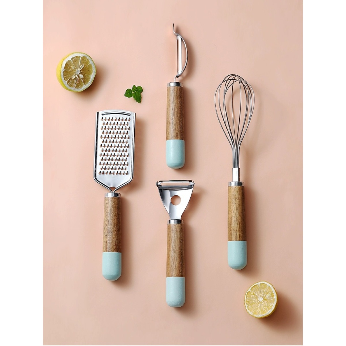 Specifications: Whisk, flat grater, D-type runner, Y-type planerMaterial: solid wood, stainless steelUses: kitchenware