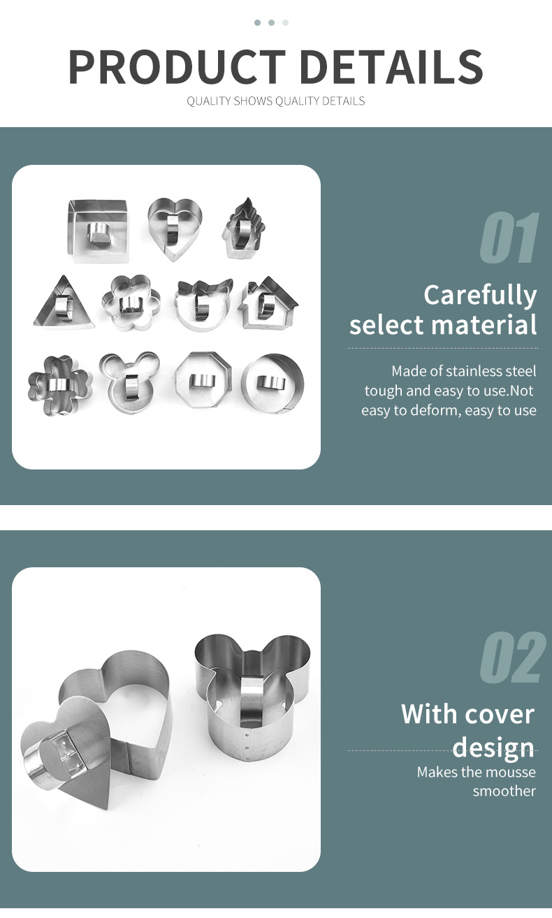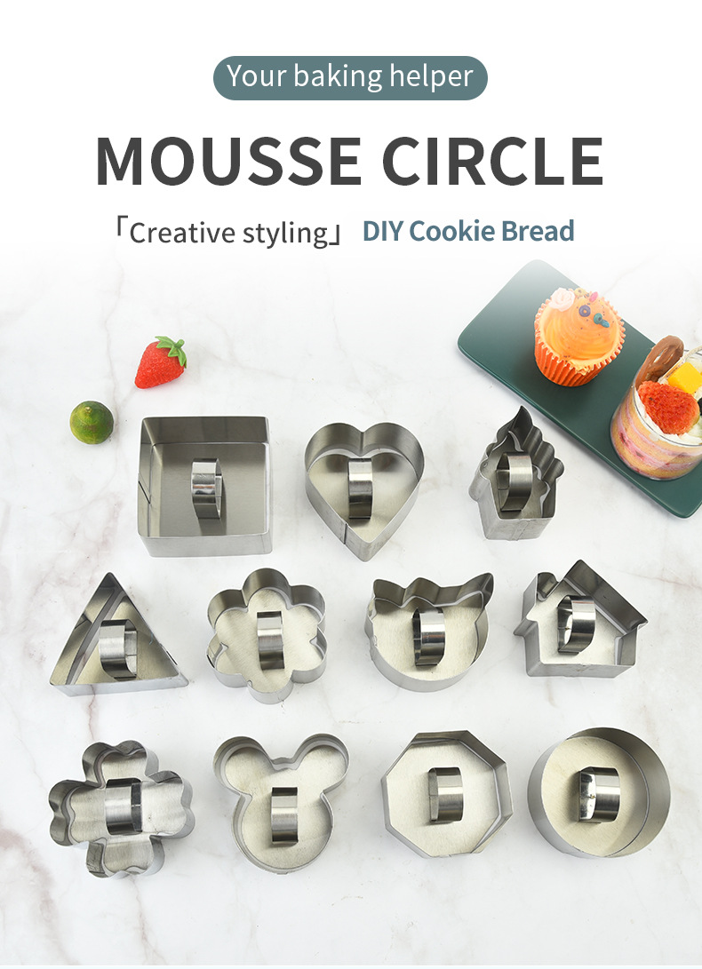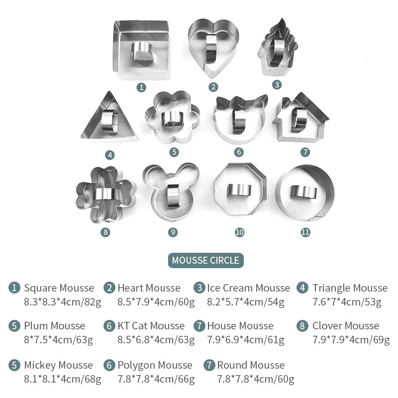 Specifications: Square mousse mold, heart-shaped mousse mold, ice cream-shaped mousse mold, Triangle mousse mold, flower-shaped mousse mold, Hello Kitty-shaped mousse mold with lid, shell-shaped mousse mold, four-leaf clover mousse mold, mouse-shaped mousse mold, polygonal mousse mold, round mousse ring mousse mold