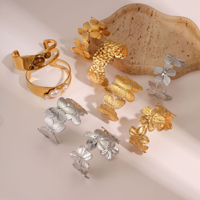 Color: NMSB-H546-2 Gold pearl bracelet, NMSB-H546-4 Tigereye bracelet, NMSB-E259-1 gold butterfly bracelet, NMSB-E259-2 steel butterfly bracelet, NMSB-E252-1 Golden hollow bracelet, NMSB-E252-2 steel hollow bracelet, NMSB-E258-1 gold flower bracelet, NMSB-E258-2 steel hollow bracelet, NMSB-F251-1 Golden, round bracelet, NMSB-A423-3 hammered bracelet, NMSB-E254-1 gold concave bracelet, NMSB-H715-1 gold wide bracelet
