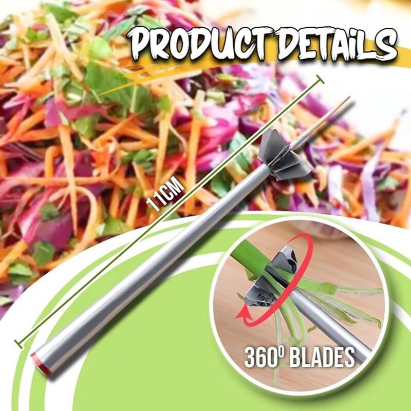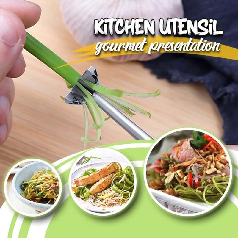 The plum blossom onion cutter is a thin metal rod attached to a round, sharp blade arranged like spokes. Designed for chopping Onions, shells or any evenly thin vegetable.