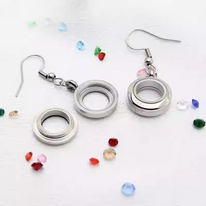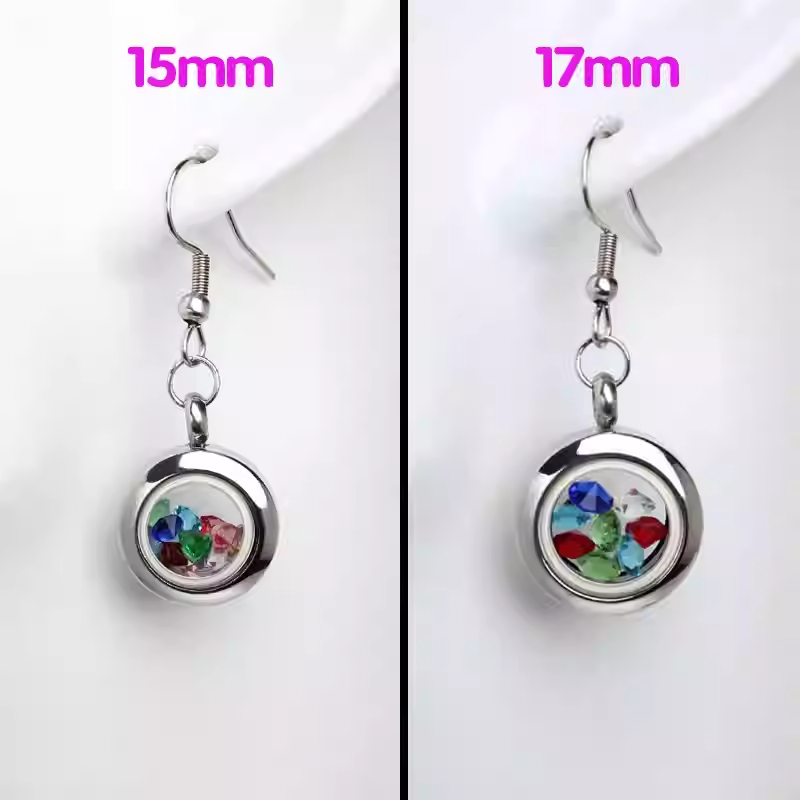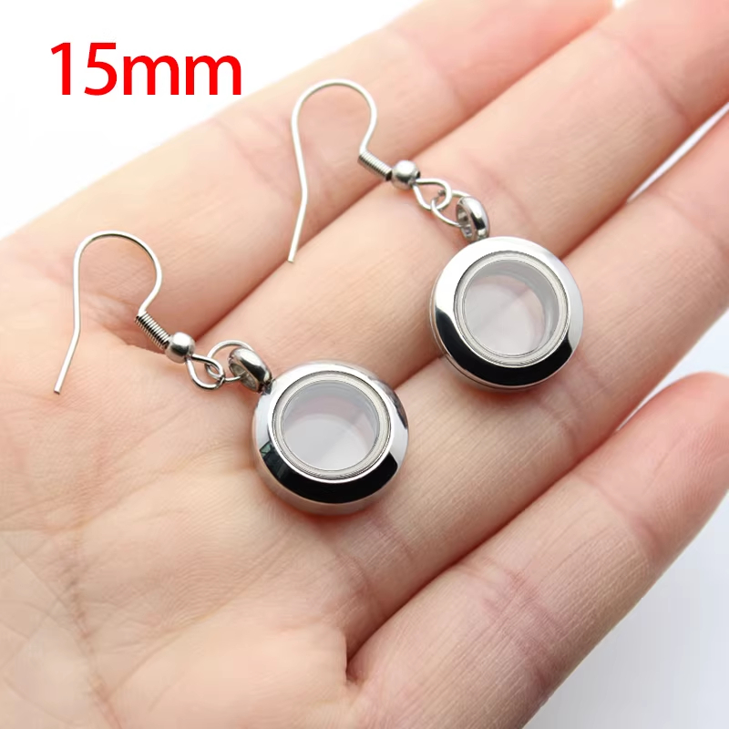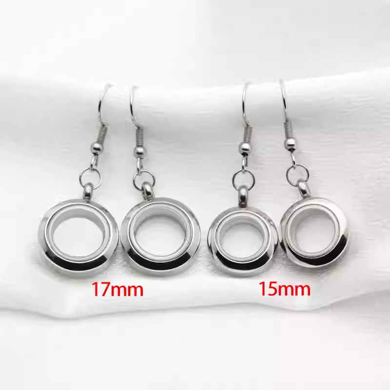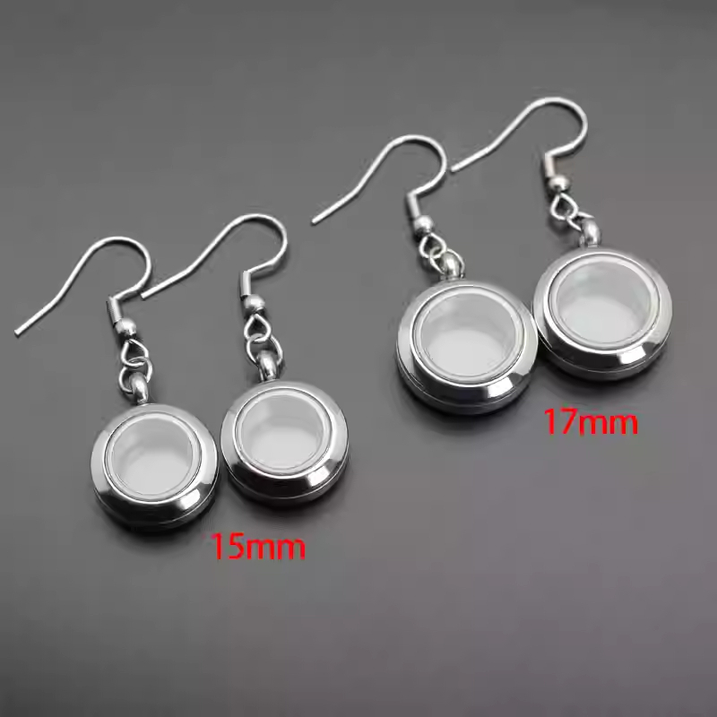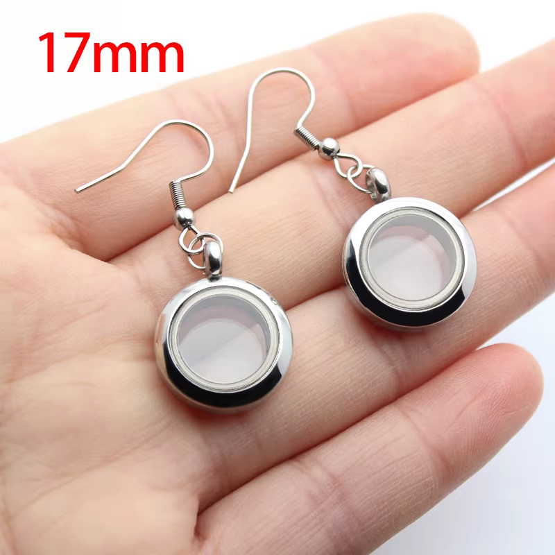 Colors: 15mm steel-color stainless steel glass-frame earrings (1 pair), 17mm steel-color stainless steel glass-frame earrings (1 pair)