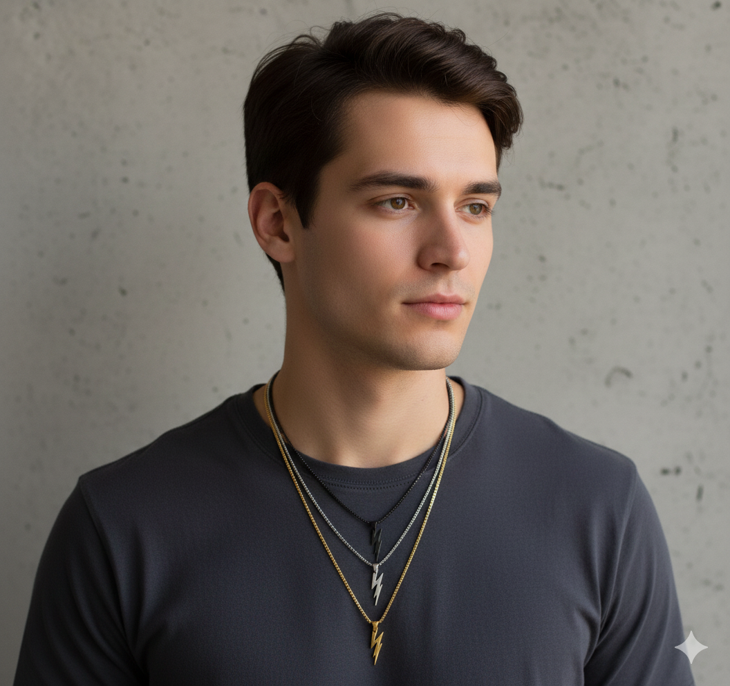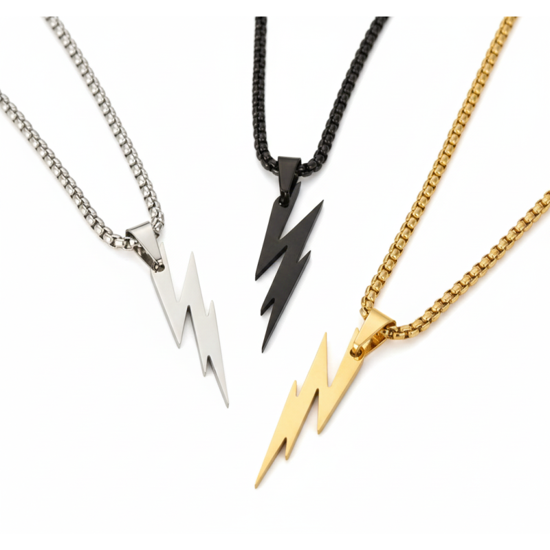 This stainless steel silver woven chain lightning necklace offers a modern and striking look suitable for daily wear. The woven chain design provides a bold stylish appearance while the lightning pendant adds a dynamic and unique touch. Crafted from durable stainless steel it maintains its shine and resists tarnishing for long lasting use. Comfortable and versatile it pairs well with casual and contemporary outfits. Ideal for those who enjoy minimal yet eye catching jewelry.