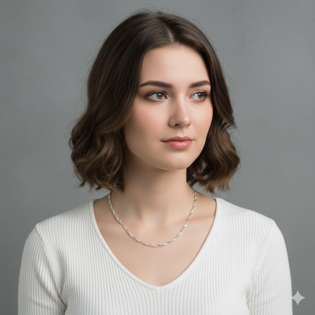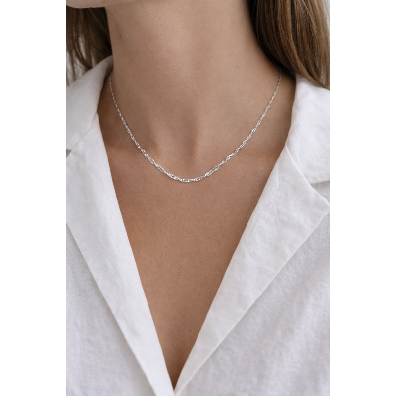 This stainless steel unisex silver Singapore chain necklace offers a sleek and elegant style suitable for daily wear. The classic Singapore chain design provides a refined shine and smooth movement while the durable steel structure ensures long lasting resistance to tarnishing. With its 45 cm length it rests comfortably on the neckline and pairs well with both casual and dressy outfits. A versatile choice for anyone who prefers minimal modern and timeless chain accessories.