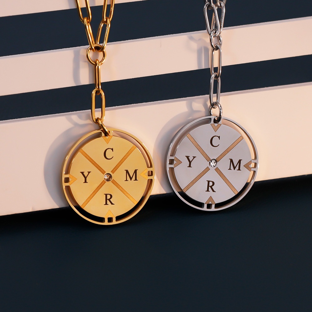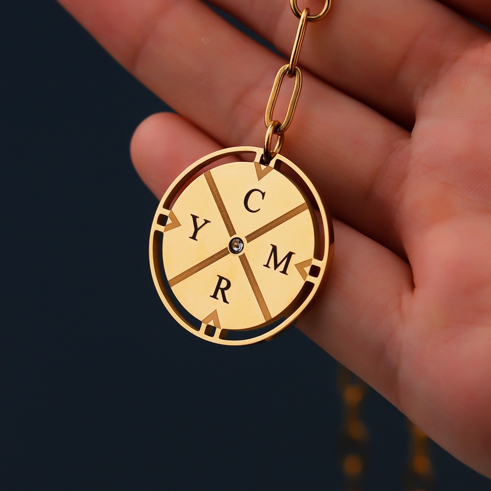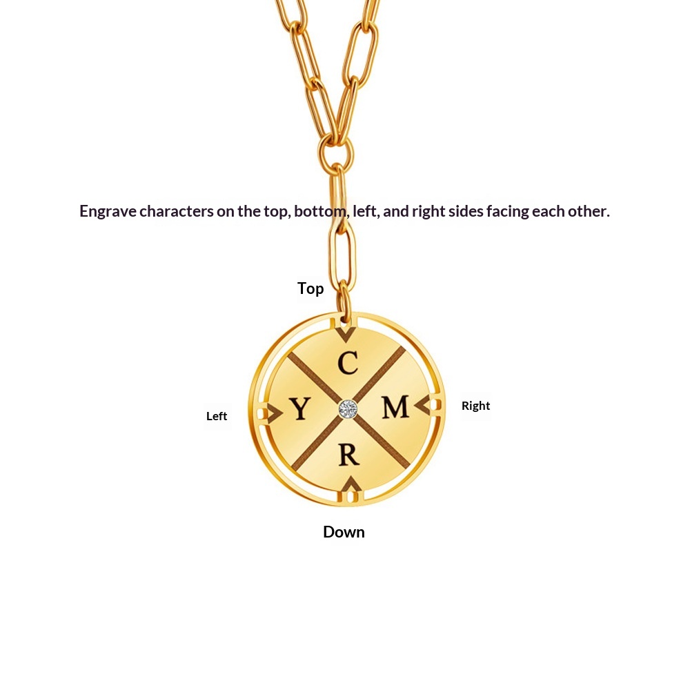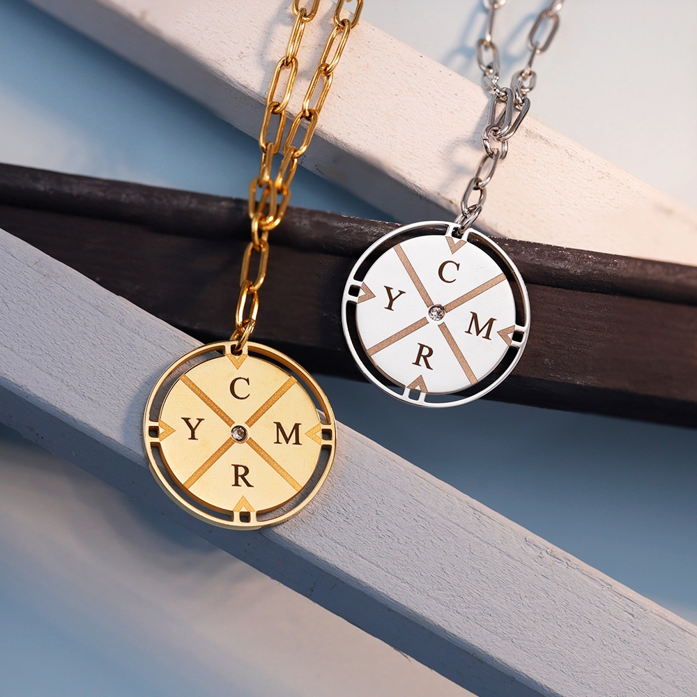 Color: Steel-colored diamond-encrusted compass necklace + engraving details, gold-colored diamond-encrusted compass necklace + engraving details