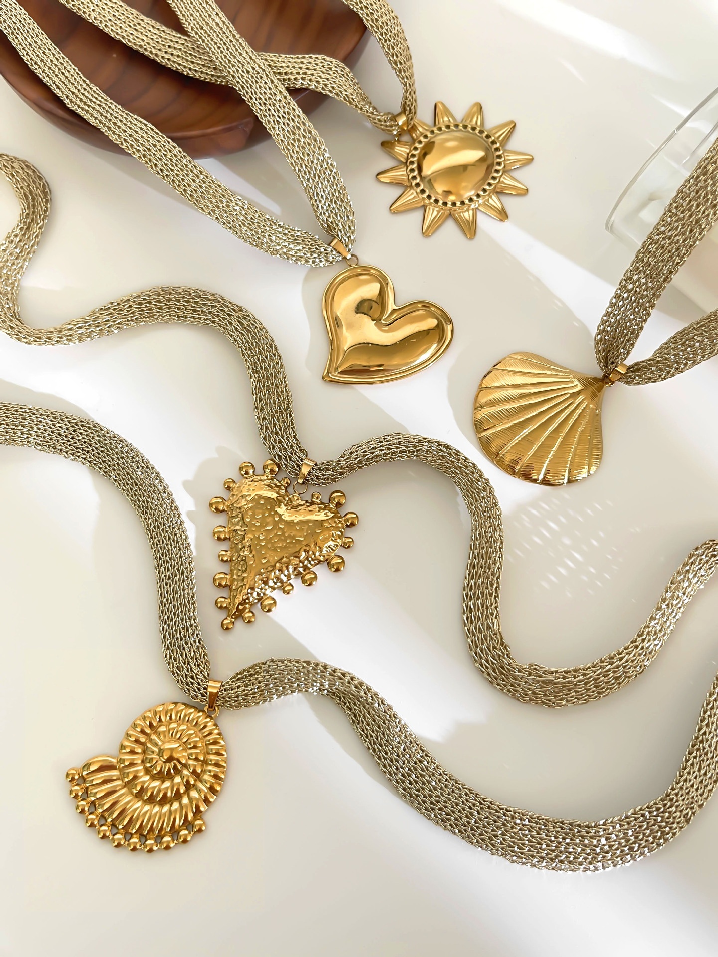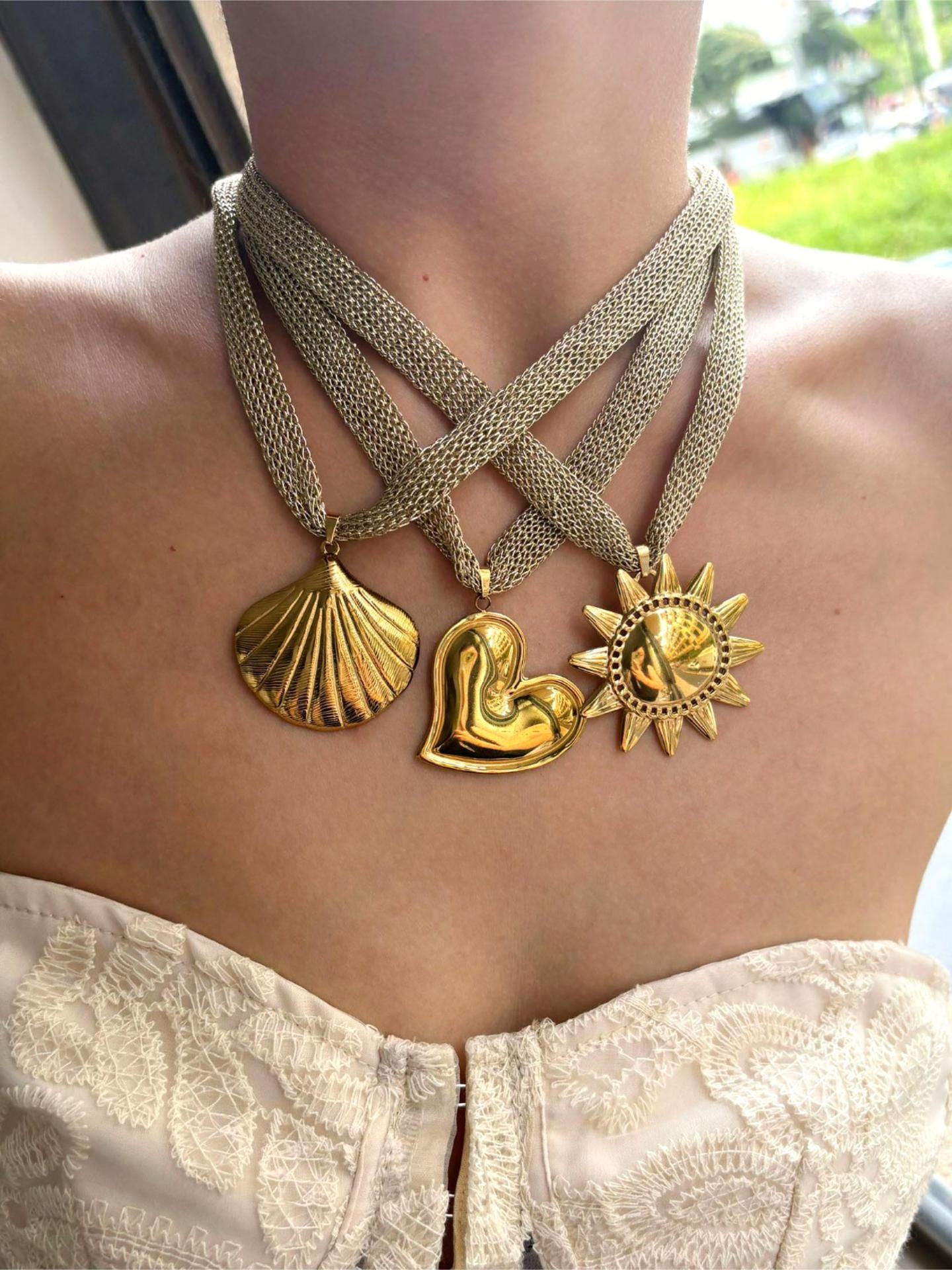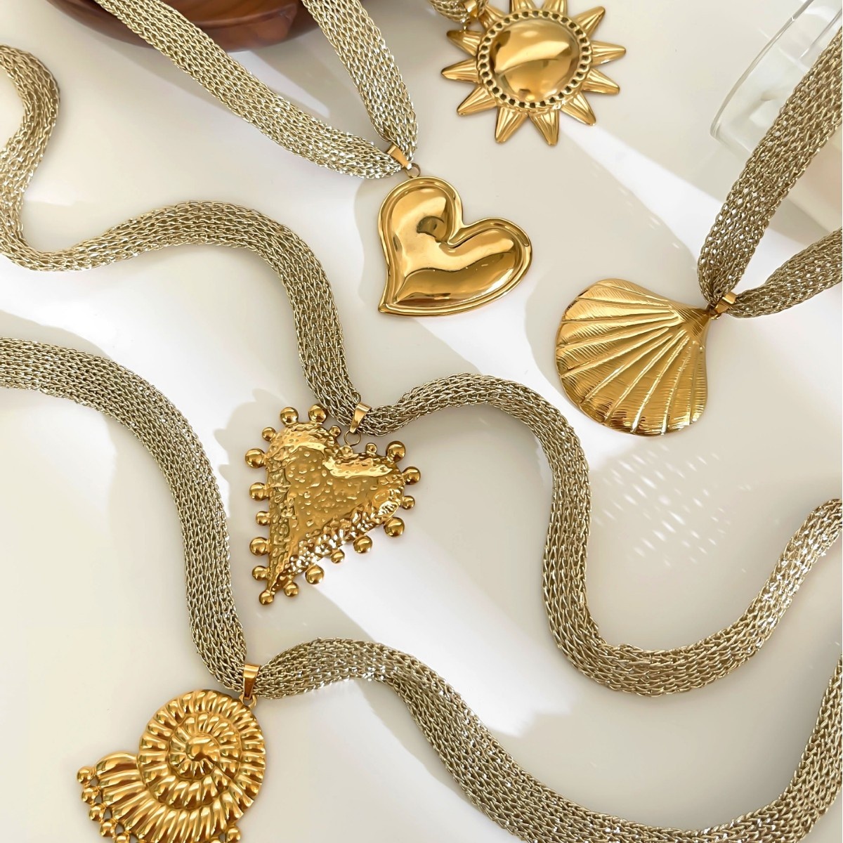 Color: Gold Sun Necklace, gold conch necklace, Gold scallop necklace, gold oblique love necklace, golden dots love necklace, golden dots love conch two-piece necklace, gold main picture oblique love scallop sun three-piece necklace