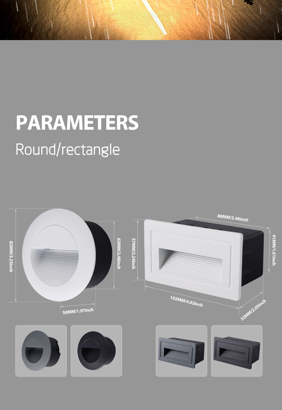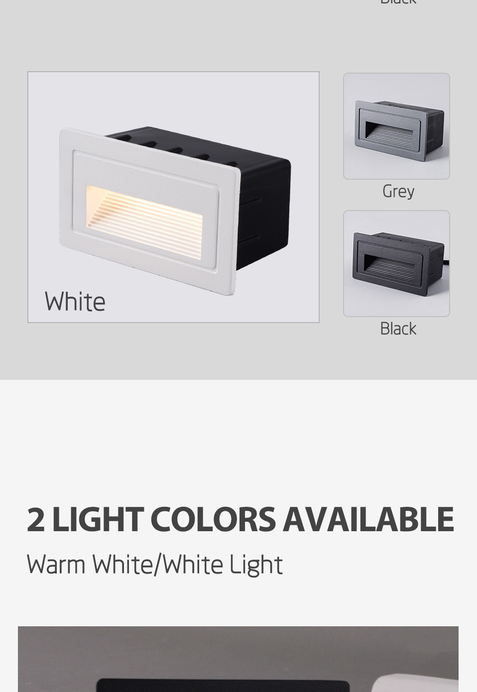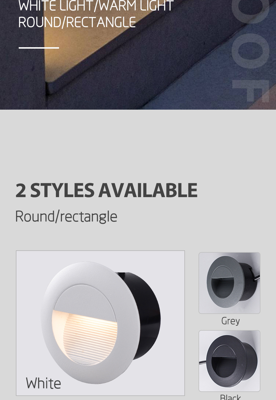 Power: White Round warm light, white round white light, gray round warm light, gray round white light, black round warm light, black round white light, white rectangular warm light, white rectangular white light, gray rectangular warm light, gray rectangular white light, black rectangular warm light, black rectangular white light