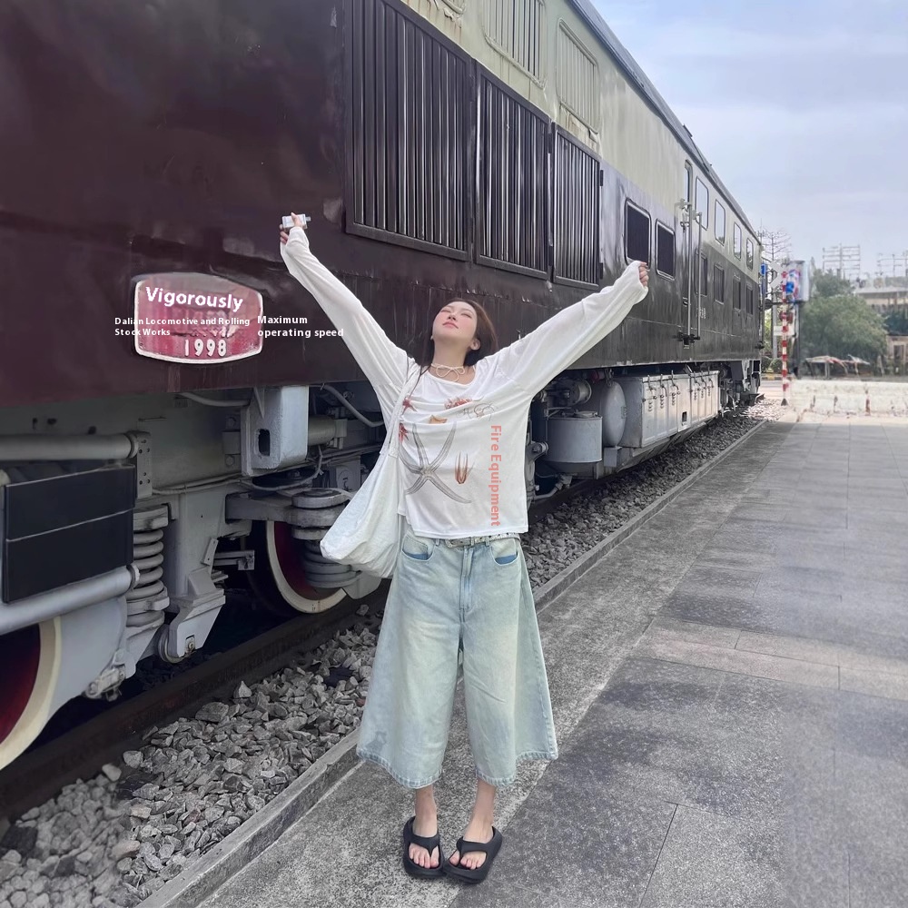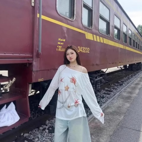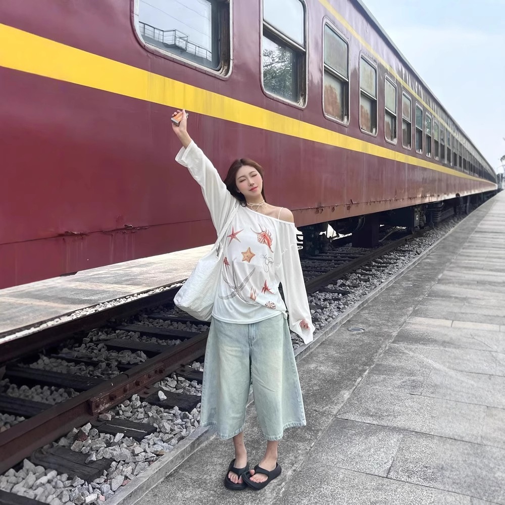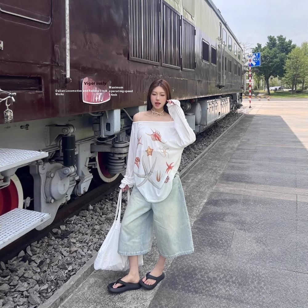 Starfish Printed Wide Collar Off-the-shoulder Sun Protection Long Sleeve T-shirt Women