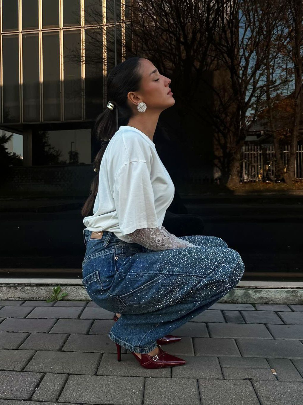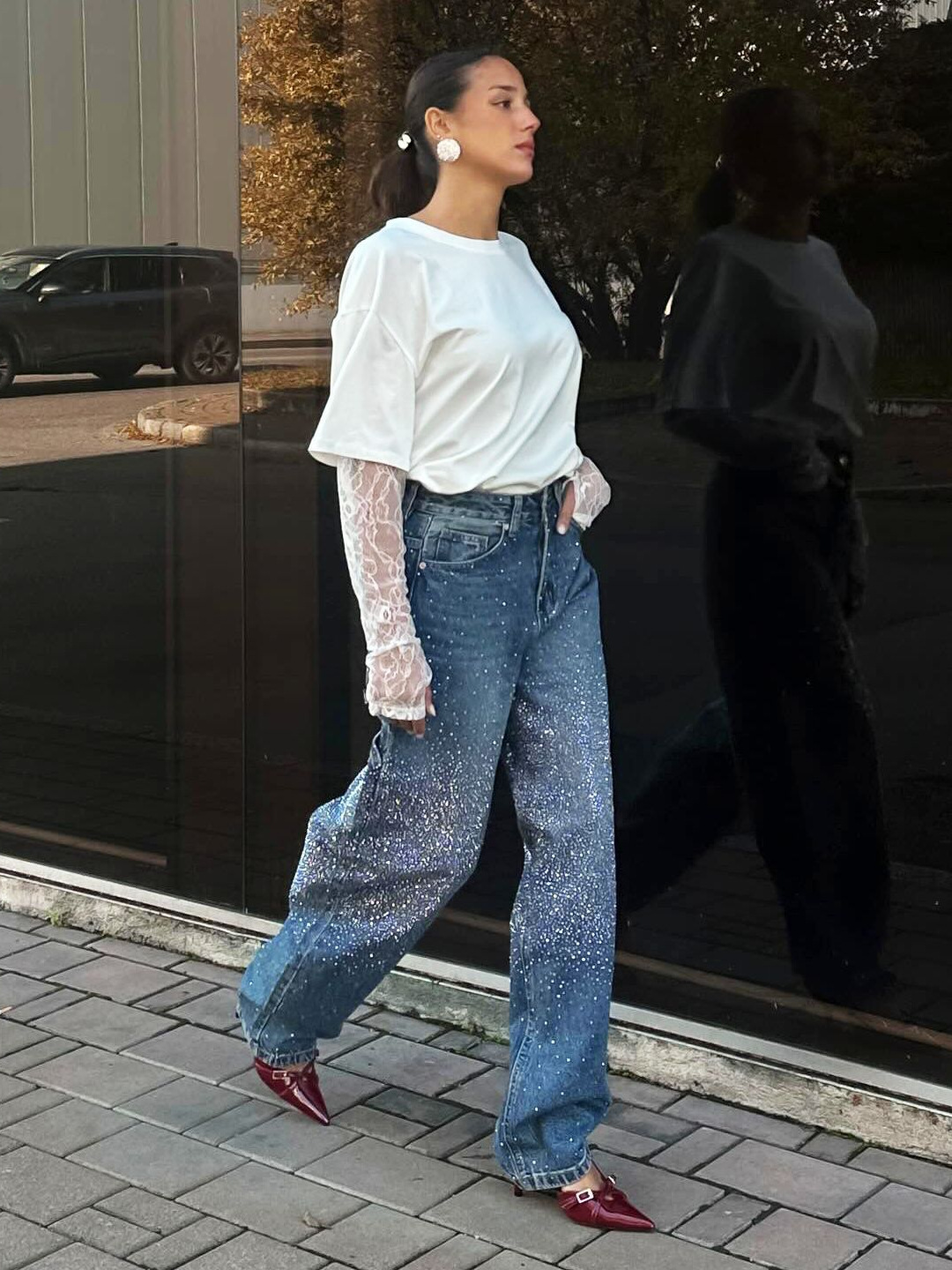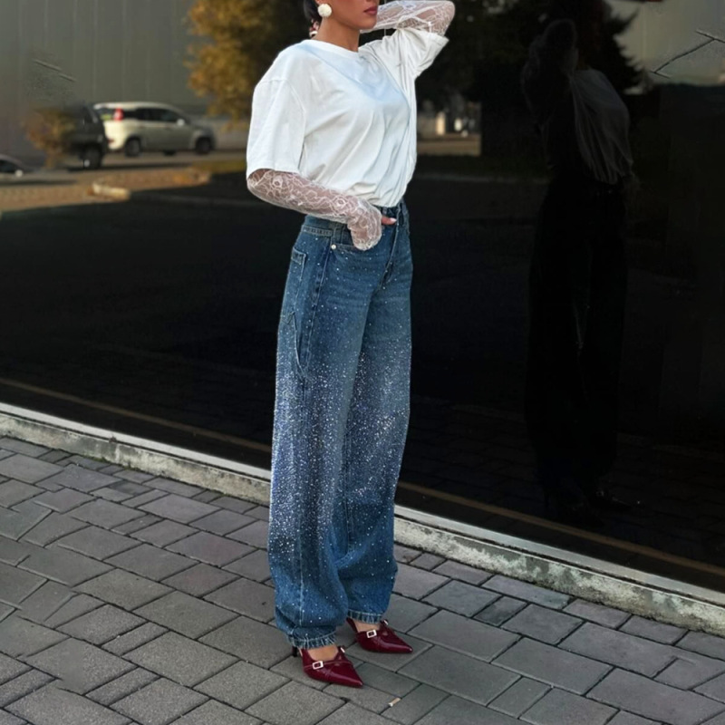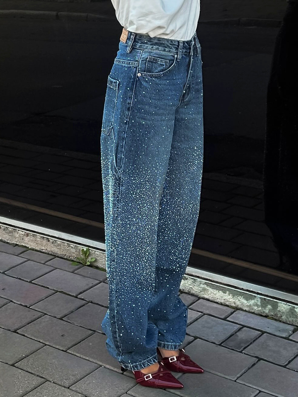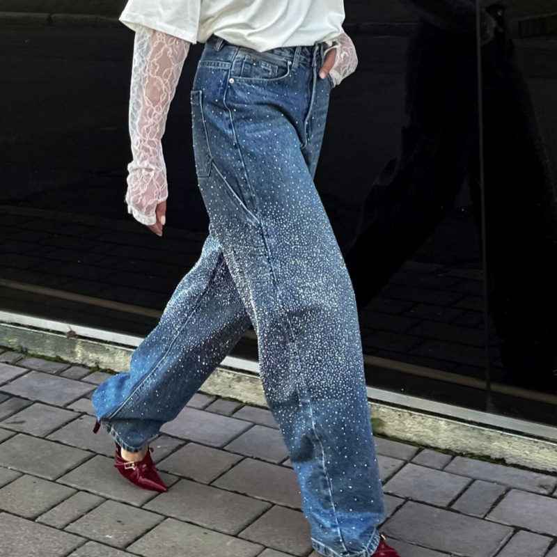 Starry Sky Rhinestone Denim Female Autumn Straight Pants