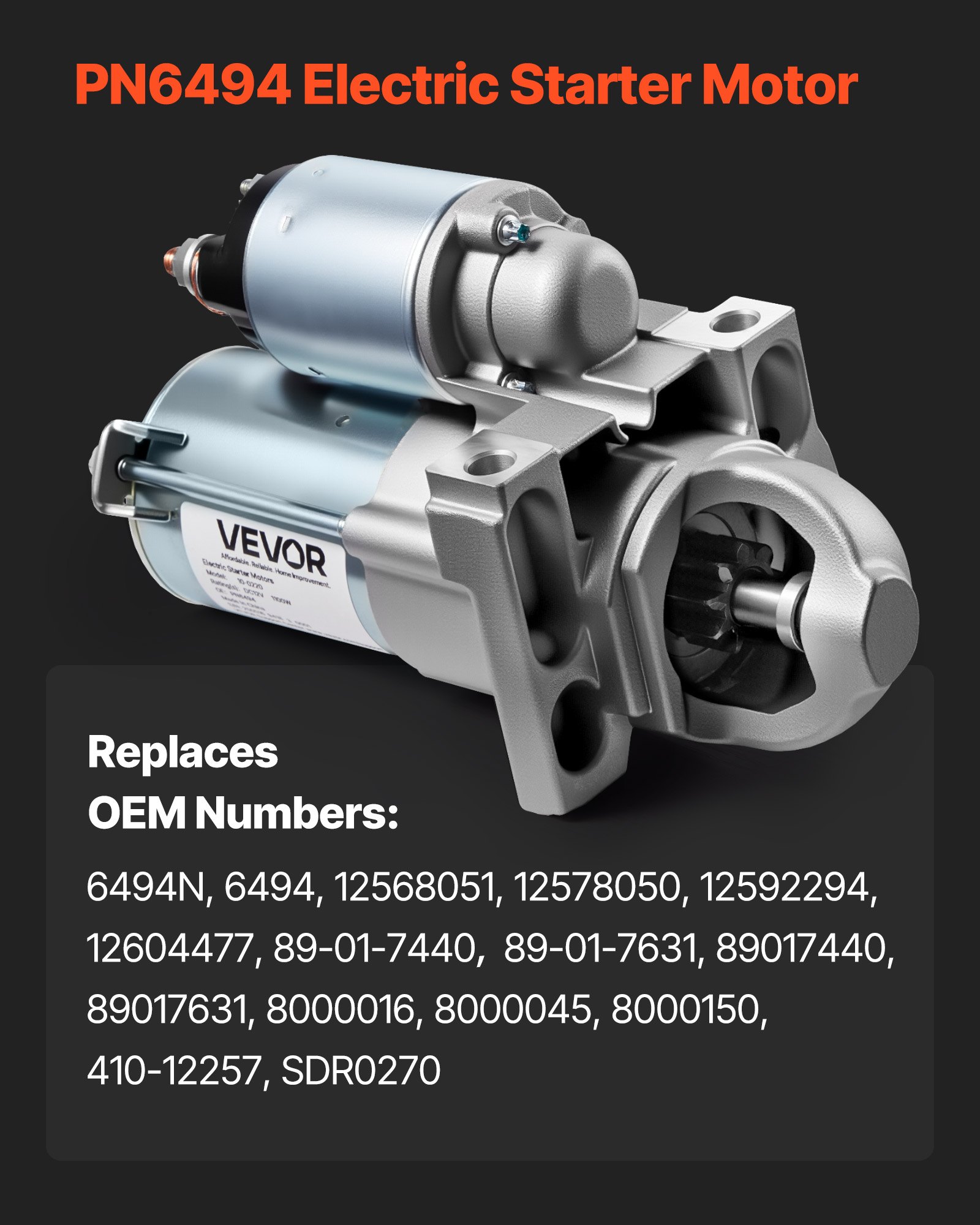 OE Specifications: Starter Motor OE Number: PN6494. Replaces OEM Numbers: 6494N, 6494, 12568051, 12578050, 12592294, 12604477, 89-01-7440, 89-01-7631, 89017440, 89017631, 8000016, 8000045, 8000150, 410-12257, SDR0270