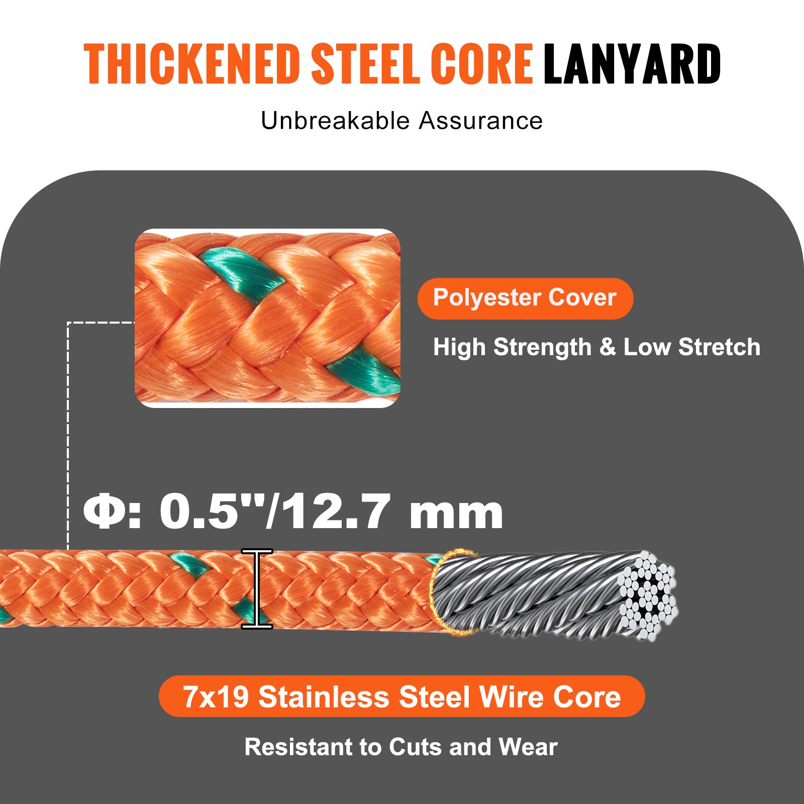 Climb with Confidence: Secure your tree climbing work at heights with the VEVOR 12 ft steel-core flipline. This steel rope boasts a durable 0.5'' diameter and a robust 25 kn breaking strength, compliance with ANSI standards, ensuring your fall protection. A must-have tool for tree climbers.
