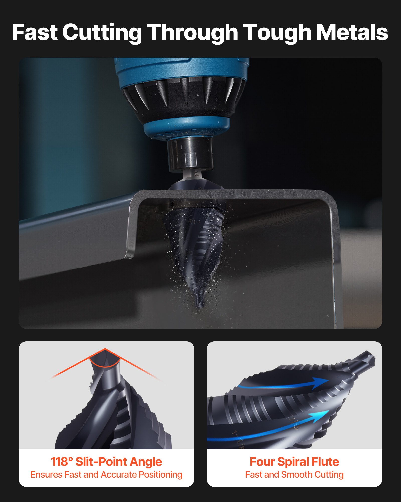 Optimized Cutting Angle: Our step drill bit for metal features a 118° tip and four-flute design, ensuring fast chip clearing, less heat buildup, and clean, burr-free holes in wood, plastic, and fiberglass