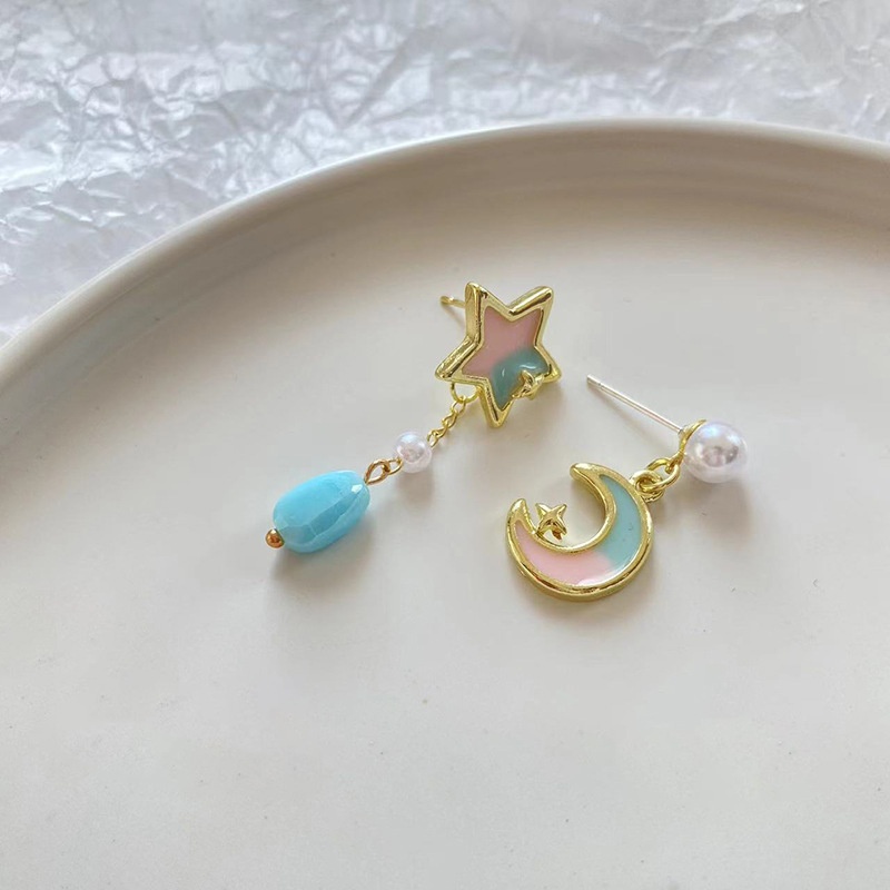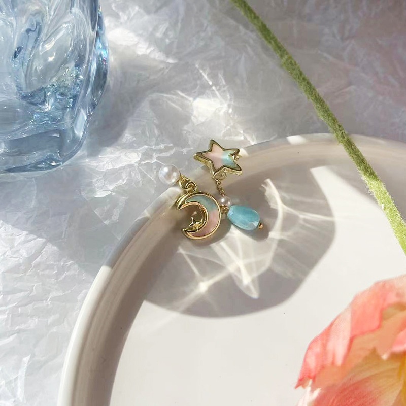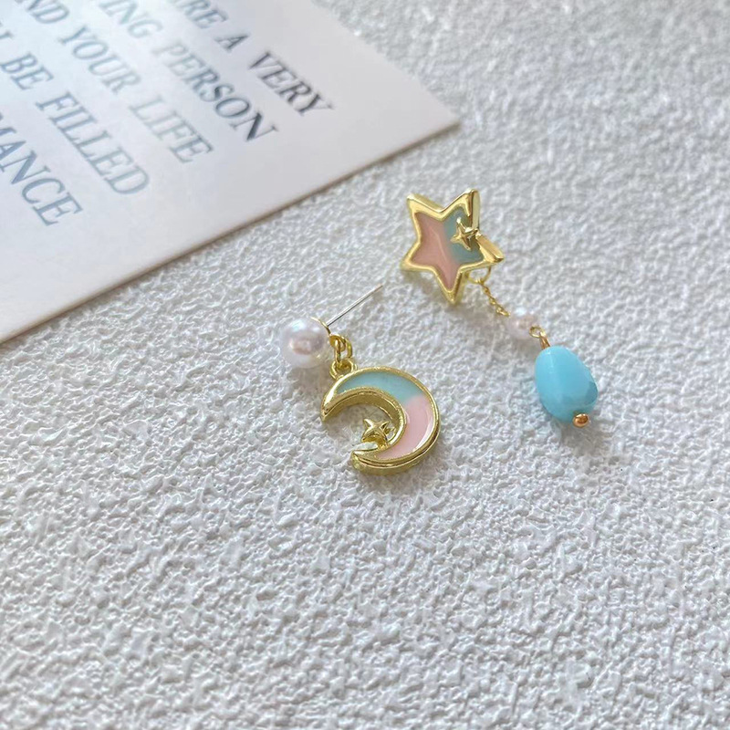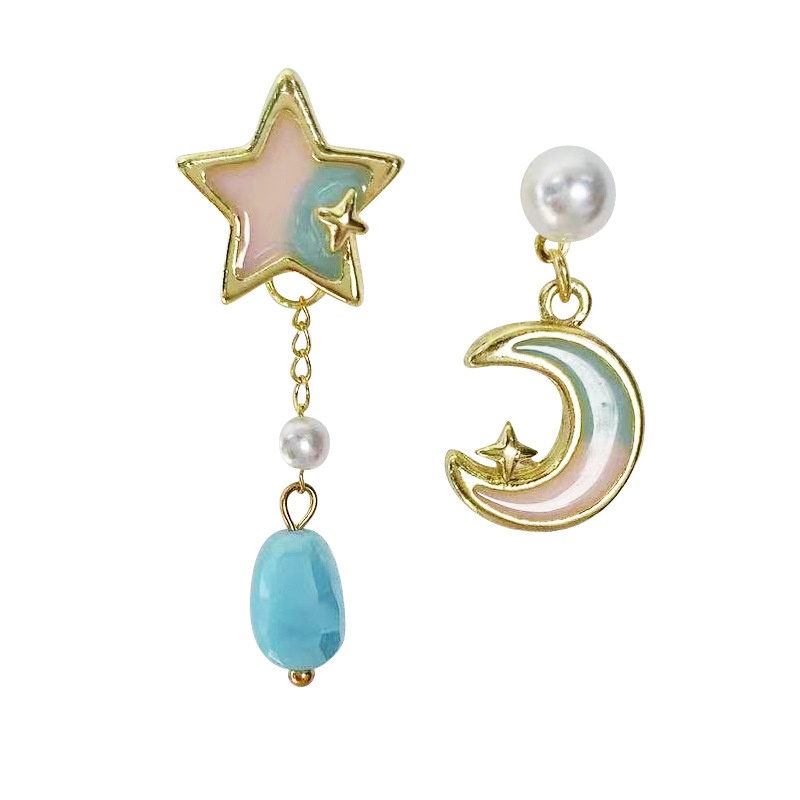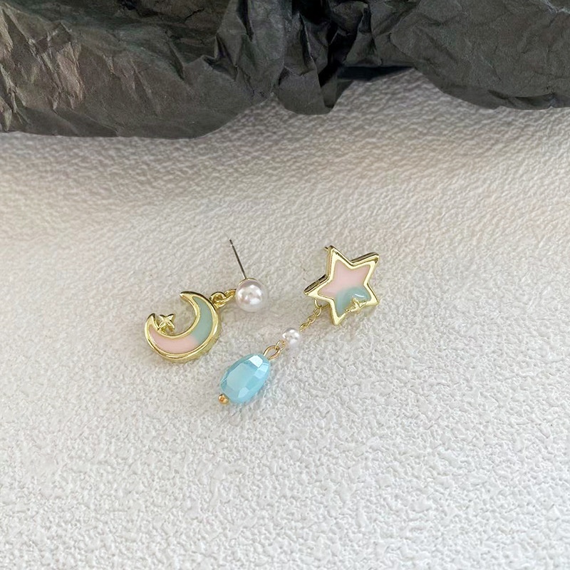 Color: sterling silver needle asymmetric star and moon ear studs-as the main image