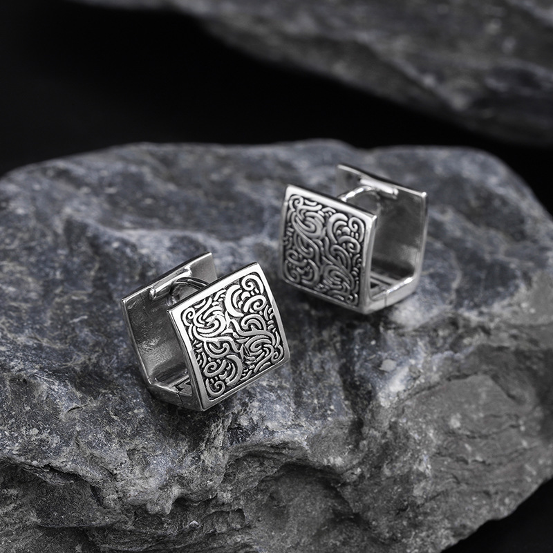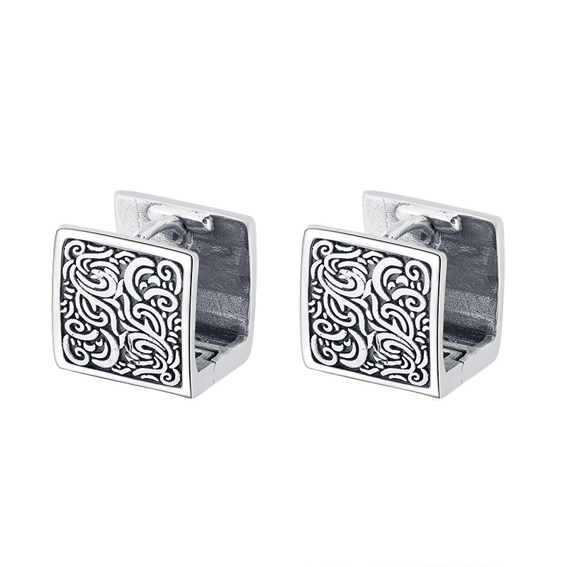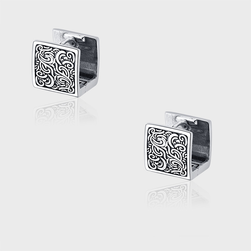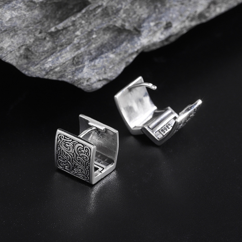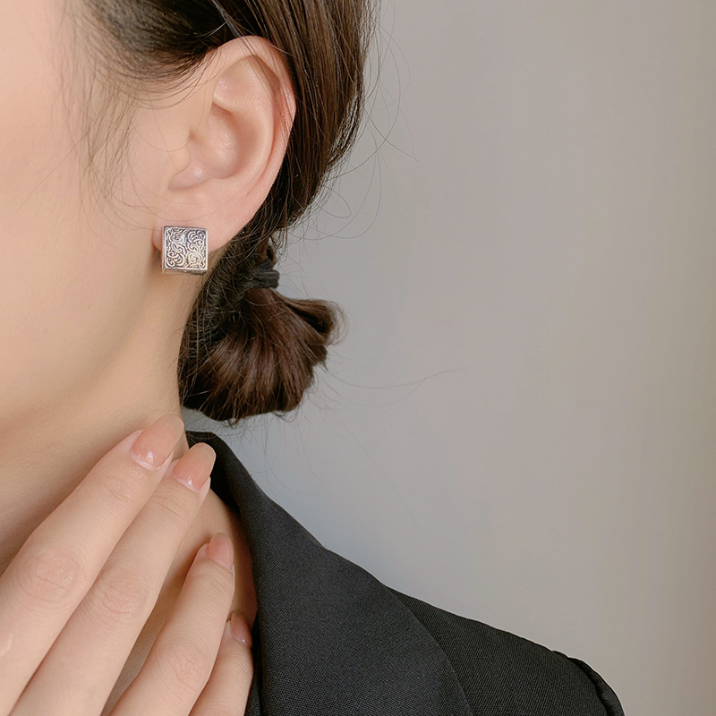 Sterling Silver Retro Thai Silver National Style Auspicious Cloud Matte Frosted Square Versatile Simple Earrings