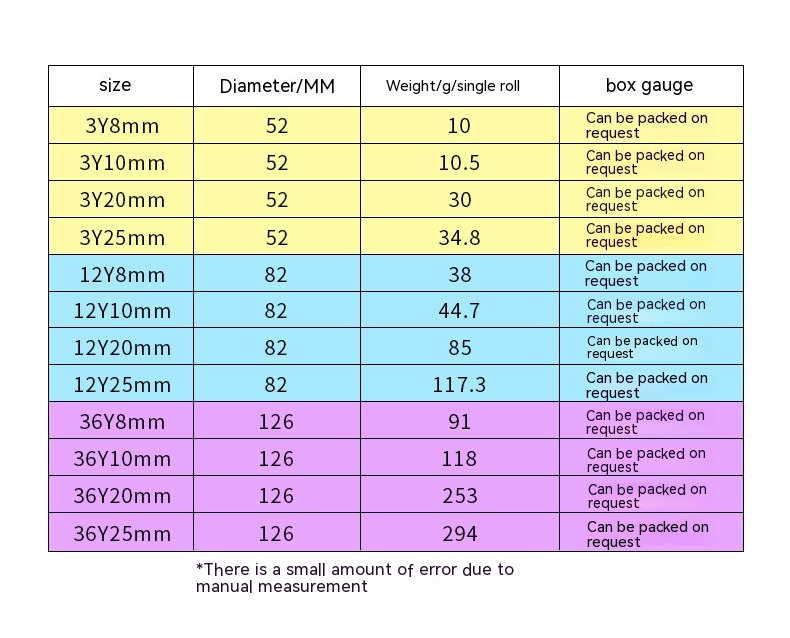 Color: blue stripe, green stripe, khaki stripe, white stripe, purple stripe, black stripe, Rainbow Bar, Arc Red (36 pieces/pack),3M arc (36 pieces/pack), arc Blue (36 pieces/pack), Arc white red characters (36 pieces/pack), blue with hole (36 pieces/pack), volume 3Y * 8mm (blue tape label), volume 3Y * 10mm (blue tape label), volume 3Y * mm (blue tape label), volume 3Y * 20mm (blue tape label), volume 3Y * 25mm (blue tape label), volume 12Y * 8mm (blue tape label), volume 12Y * 10mm (blue tape label), volume 12Y * mm (blue tape label), volume 12Y * 20mm (blue tape label), volume 12Y * 25mm (blue tape label), volume 36Y * 8mm (blue tape label), volume 36Y * 10mm (Blue tape label), volume 36Y * 20mm (blue tape label), volume 36Y * 25mm (blue tape label), volume 3Y * 8mm (white glue), volume 3Y * 10mm (white glue), volume 3Y * mm (white glue), volume 3Y * 20mm (white glue), volume 3Y * 25mm (white glue), volume 12Y * 8mm (white glue), volume 12Y * 10mm (white glue)