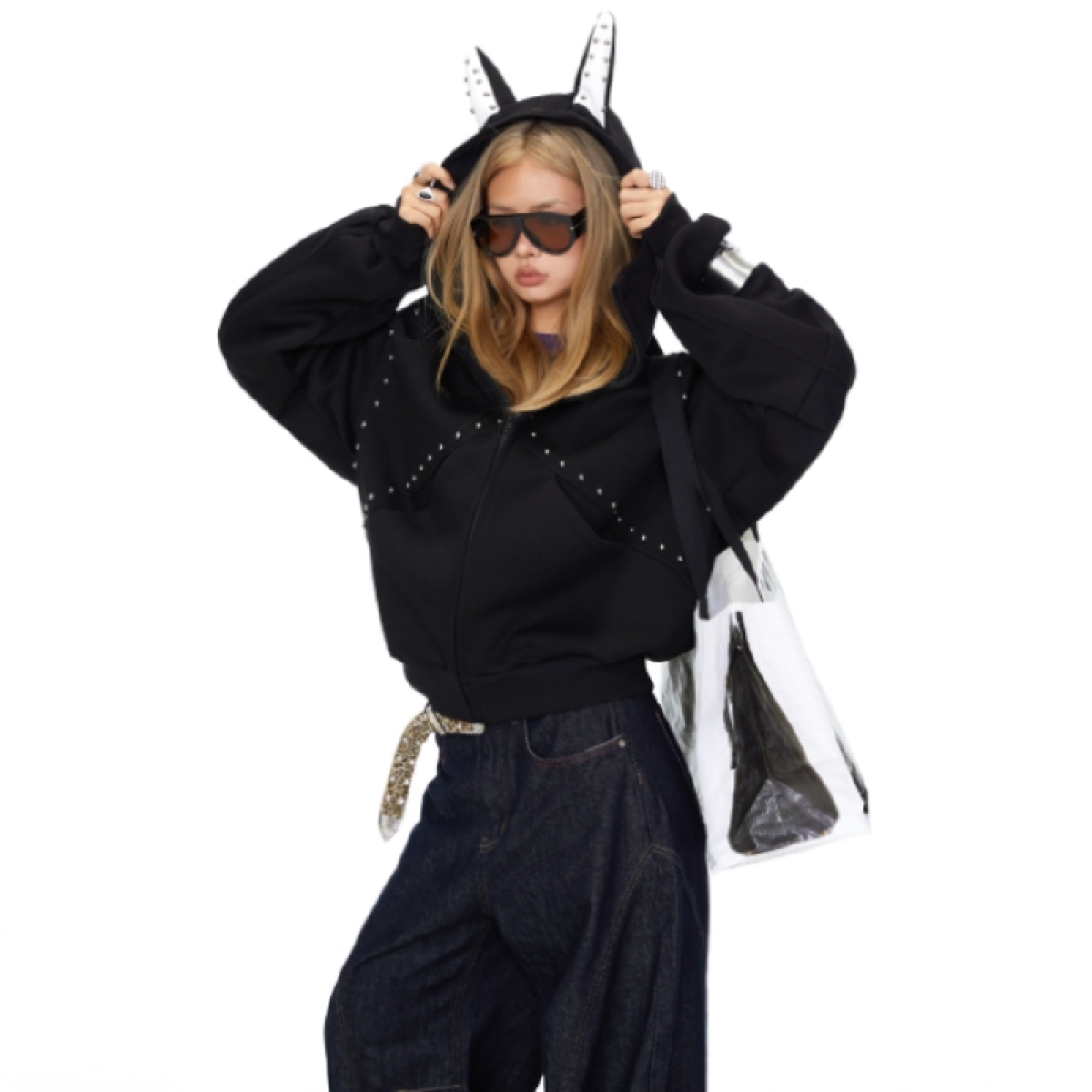 Stitching Rivet Dog Ear Hooded Loose Couple Coat