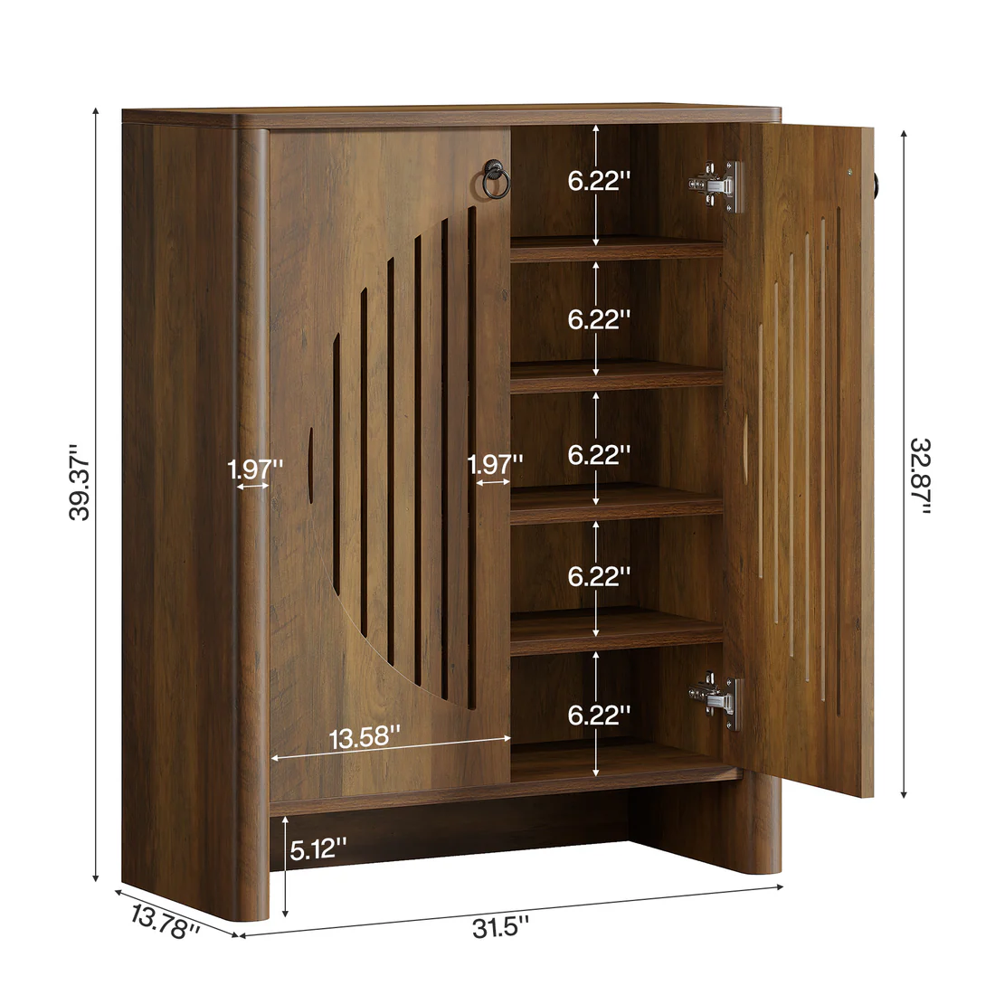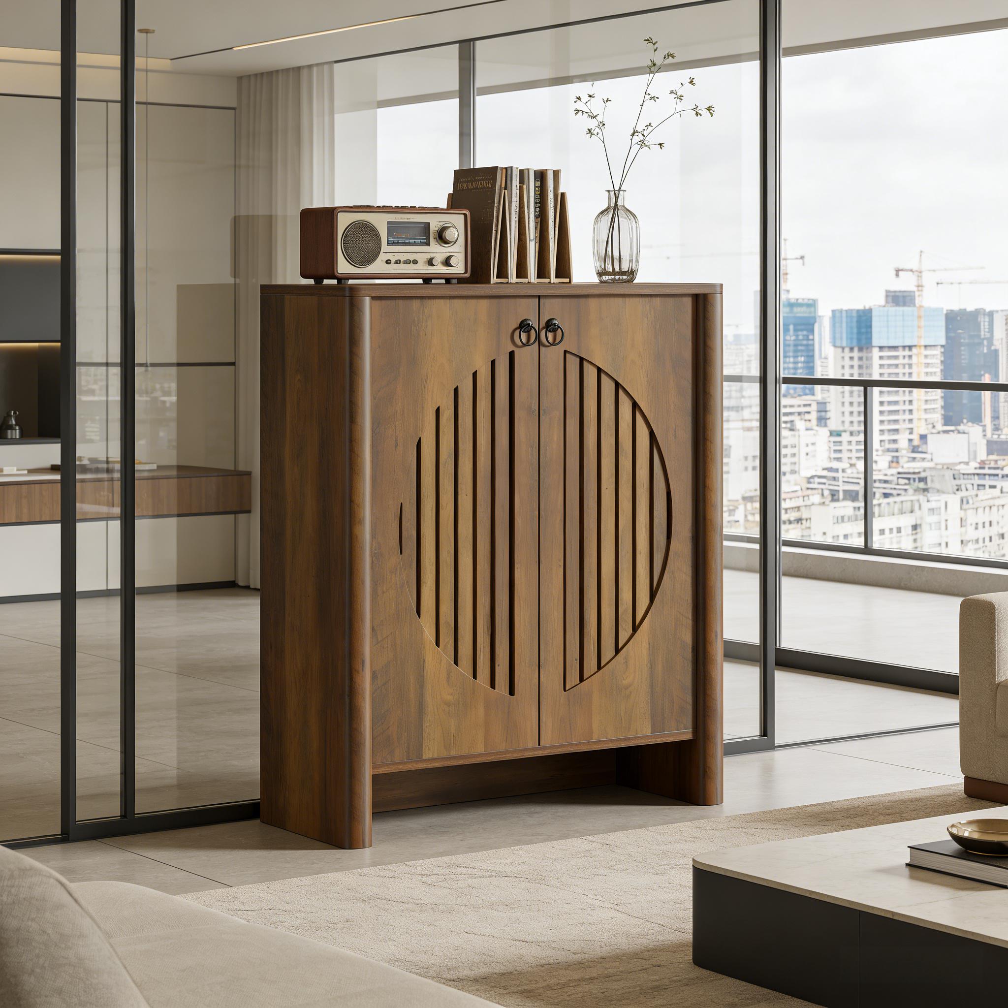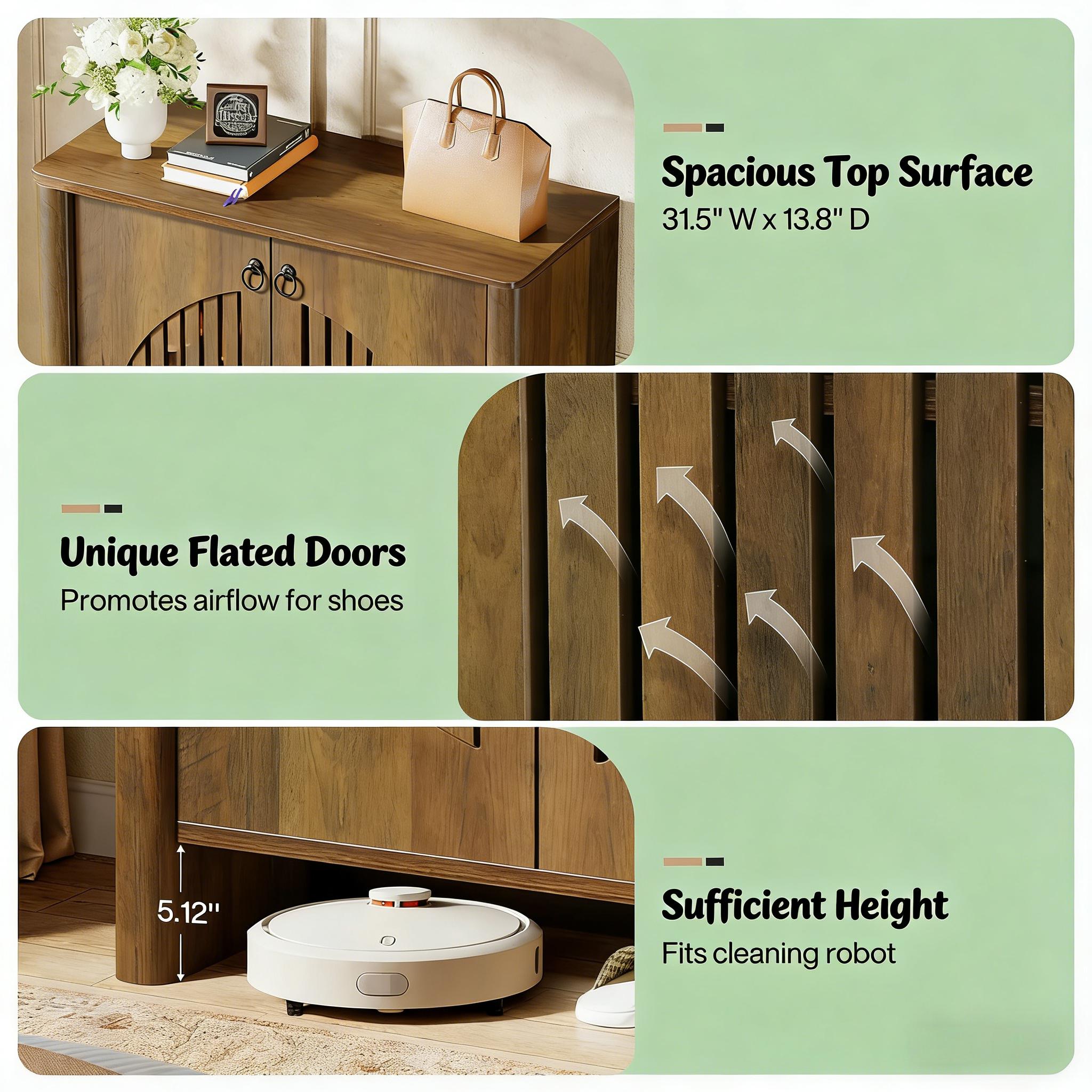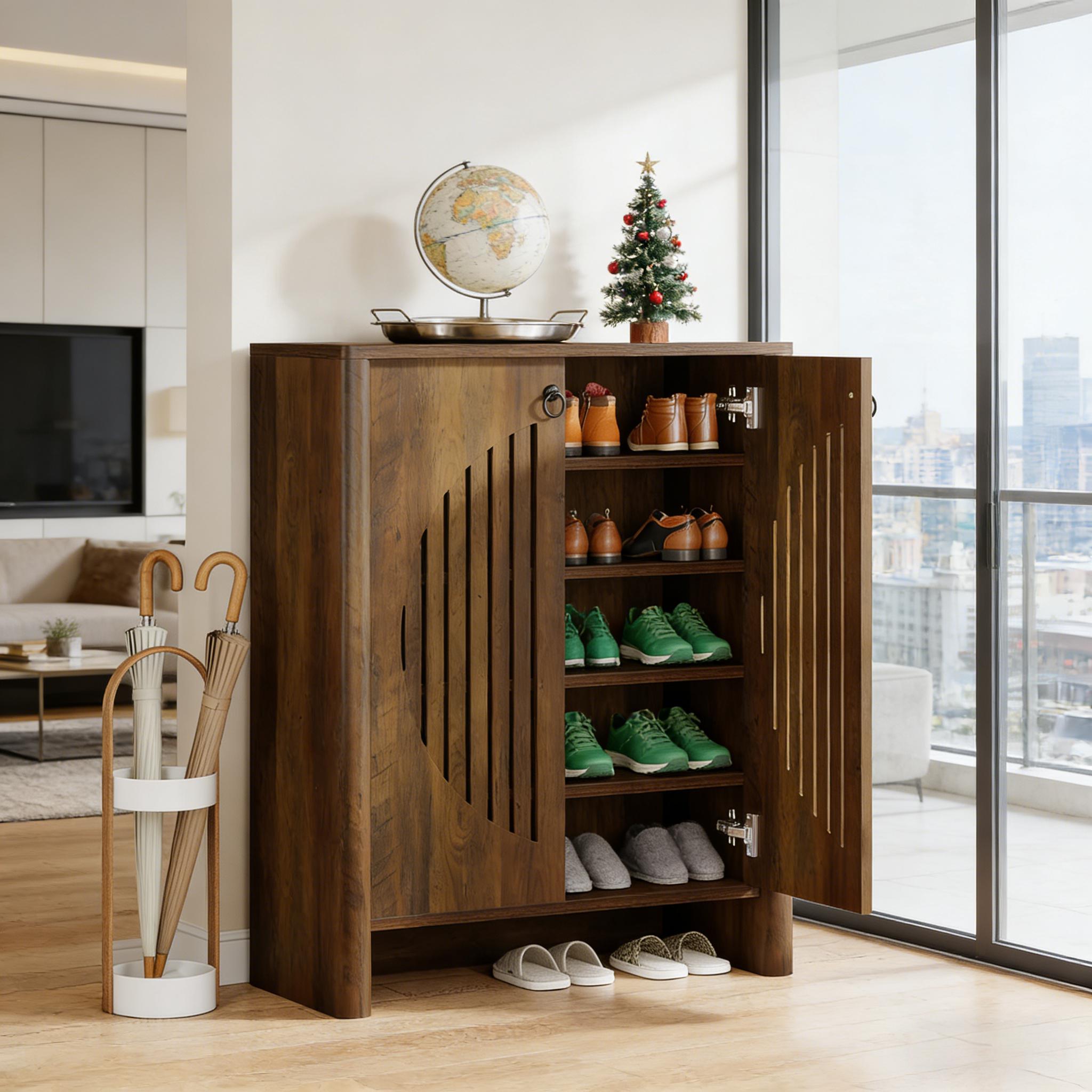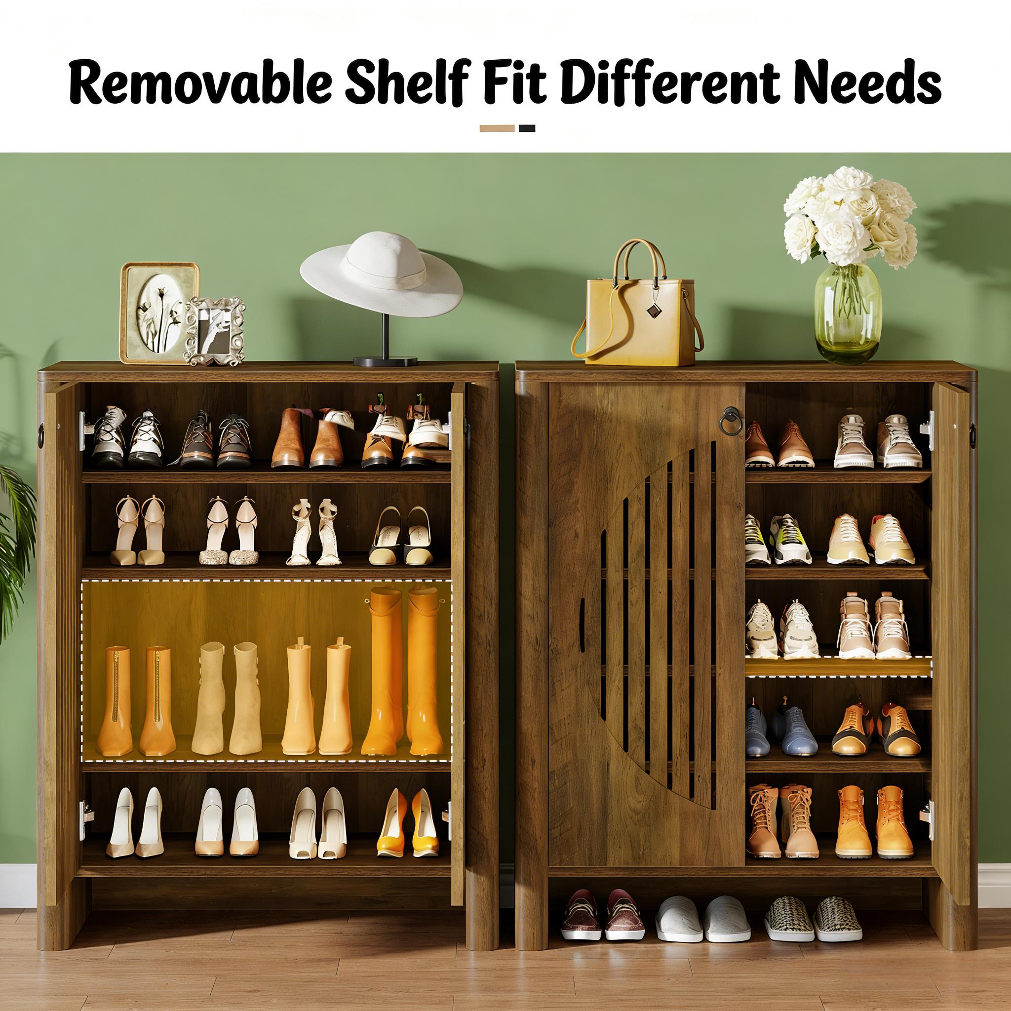 Important Reminder!!! 1) Attention: All products in our store do not support Canada self pickup ordering. Please do not create shipping labels for Canada. Our American products do not support self pickup to Canada 2)We do not ship to Alaska, Hawaii, US protectorates (e.g., Puerto Rico), P.O. boxes, or APO/FPO addresse 3)We don’t accept non-defective remorse returns Roomy & Organized Storage - This shoe storage cabinet boasts five ample shelves, providing neatly organized space for up to 20 pairs of adult shoes. Each shelf accommodates 3–4 pairs comfortably, ranging from sneakers and flats to boots and heels. Customizable Layout - Each shelf is removable (please note, the shelves are not height adjustable) for maximum flexibility. This versatile storage cabinet works beyond shoes; it's an ideal solution for tidying away everything with ease. Innovative Shoe Cabinet - Designed with round louver doors, this cabinet combines aesthetics and function. The louvers promote consistent airflow, reducing moisture and odors, hence increasing the longevity of your favorite footwear. Vintage Charm - This rustic shoe cabinet features minimalist design, combined with black handles and a classic wood grain finish. The timeless appeal blends seamlessly into any decor, infusing a touch of timeless charm to your entryway or living area. Hassle-free Assembly & Maintenance - All parts are labeled for your convenience. Detailed instructions are included along with the necessary hardware, making setup a breeze. Maintain its fresh, clean look by simply wiping with a damp cloth.