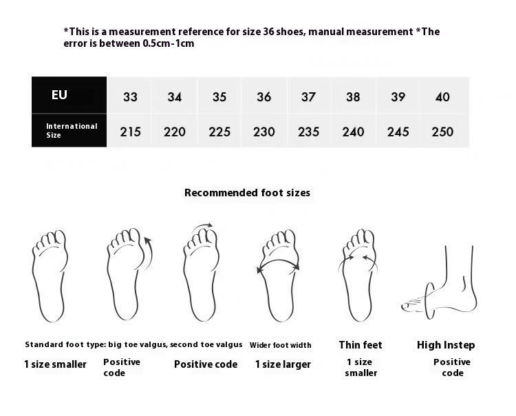 Sizes: Size 36—foot length 23 cm; Size 37—foot length 23.5 cm; Size 38—foot length 24 cm; Size 39—foot length 24.5 cm; Size 40—foot length 25 cm; Size 41—foot length 25.5 cm; Size 42—foot length 26 cm; Size 43—foot length 26.5 cm; Size 44—foot length 27 cm; Size 45—foot length 27.5 cm; Size 46—foot length 28 cm; Size 47—foot length 28.5 cm.