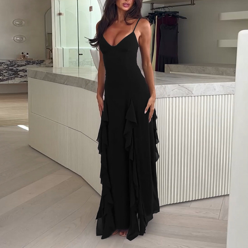 Strap Temperament V-neck Holiday Split Ruffled Dress