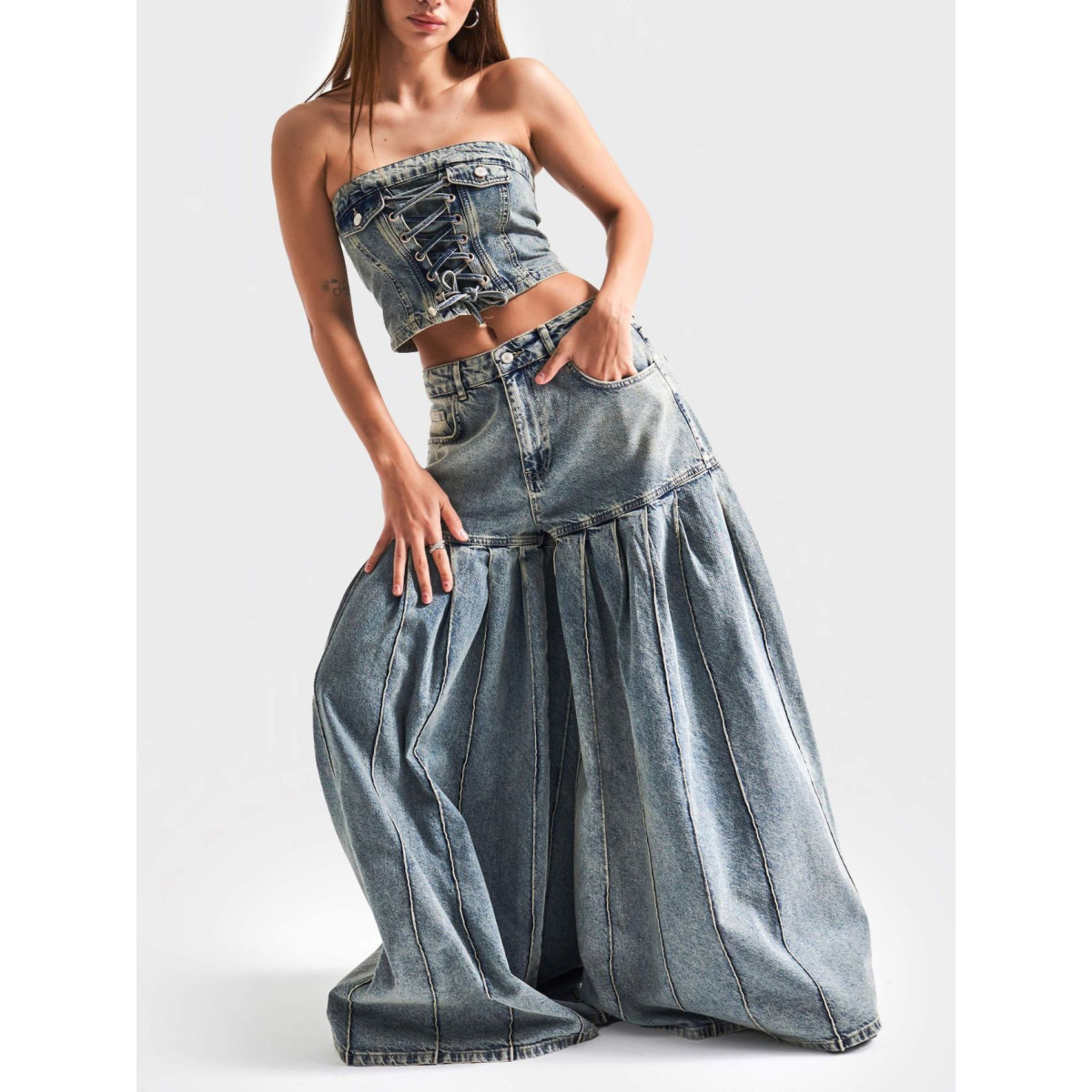 Strapless Denim Corset Crop Top & High - Waisted Pleated Wide - Leg Pants Set